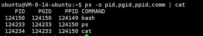 从结果上看 ps 进程的 PID 和 PGID 相同, 那也就是说明 ps 进程是该进程组的组长进 程, 该进程组包括 ps 和 cat 两个进程