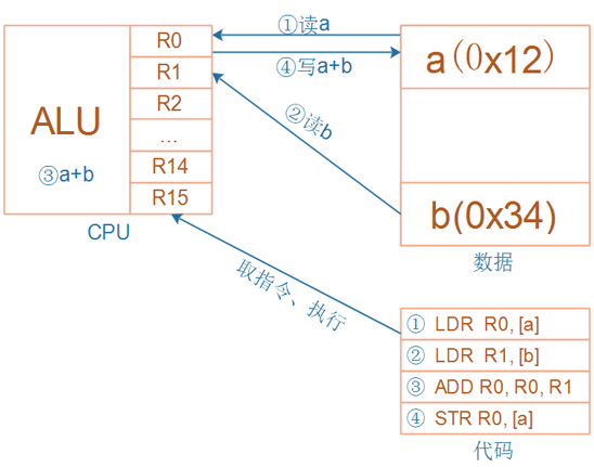 LDR R0, [a] ; 将内存地址a中的数据加载到寄存器R0