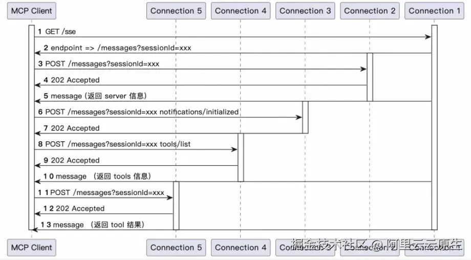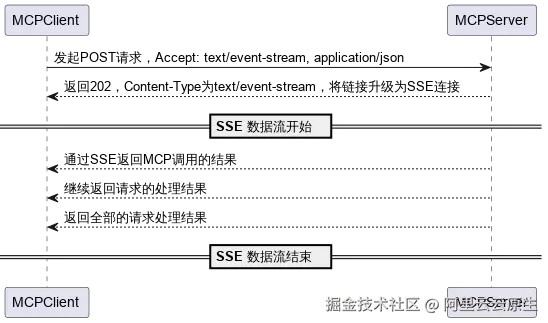在 SSE 方式下,Client 向 Server 发送请求通过/message 端点实现,每个请求是一个异步的 HTTP 请求,如果 MCP Server 接收该请求,则在响应中返回 202 状态码,后续的请求处理结果则会通过 Client 和 Server 维持的 SSE 长链接返回。