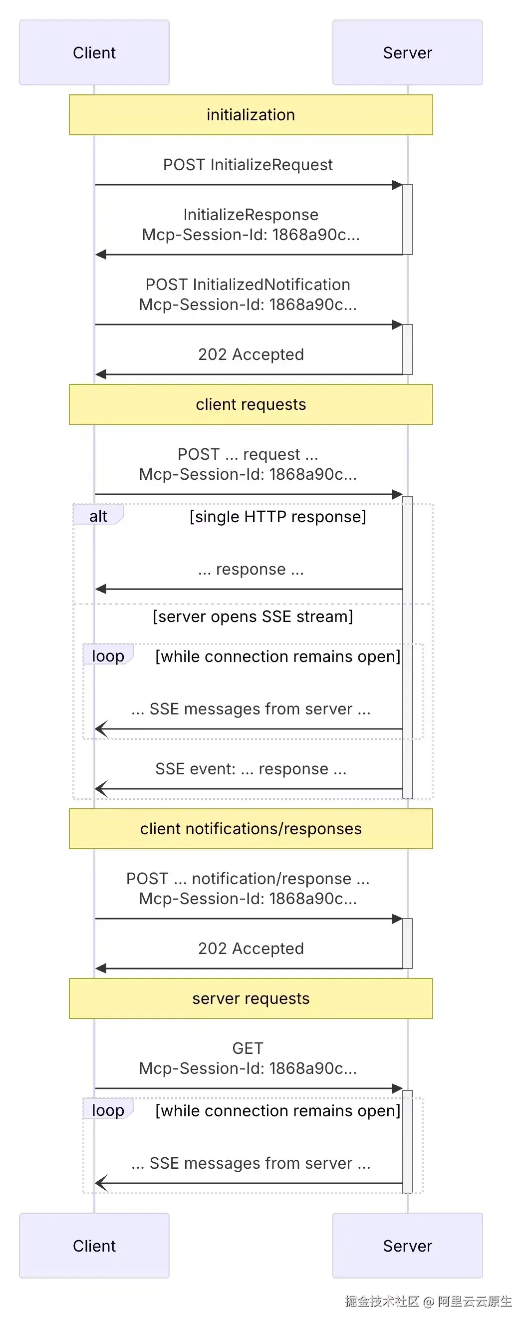 同时,如果在 GET 请求中携带了 Last-Event-ID 头,则表明该 SSE 连接是针对前述客户端请求的错误回复,MCP Server 可以在该 SSE 流上继续传输之前没有传输完成的消息,实现错误回复。