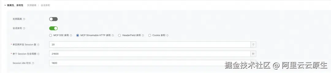 FC 为 MCP Streamable HTTP 单独增加了一种亲和类型,通过配置该亲和类型,如果函数运行的是 MCP Streamable HTTP 传输的 Server,同一个 Session 的请求都会被转发到会话所属的函数实例上。