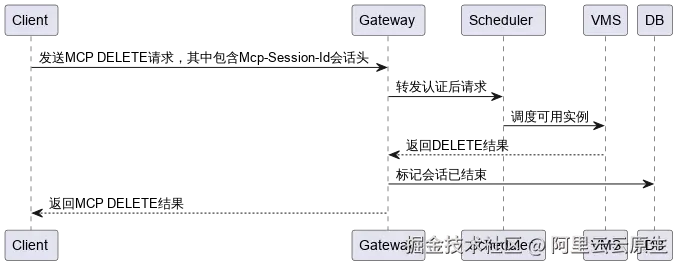 由于 MCP 本身协议的约定,在 MCP SSE 传输方式下,SSE 连接断开就标识着会话的结束。但是在 MCP Streamable HTTP 场景下,会话在被客户端显示 DELETE 之后,才会结束,因此有如下的会话结束的链路。