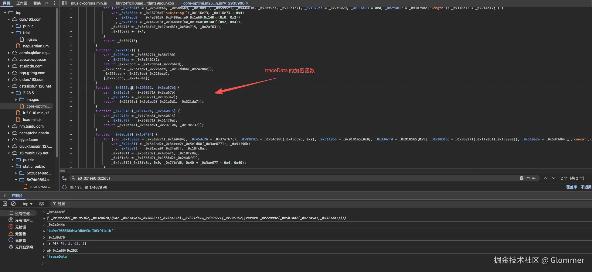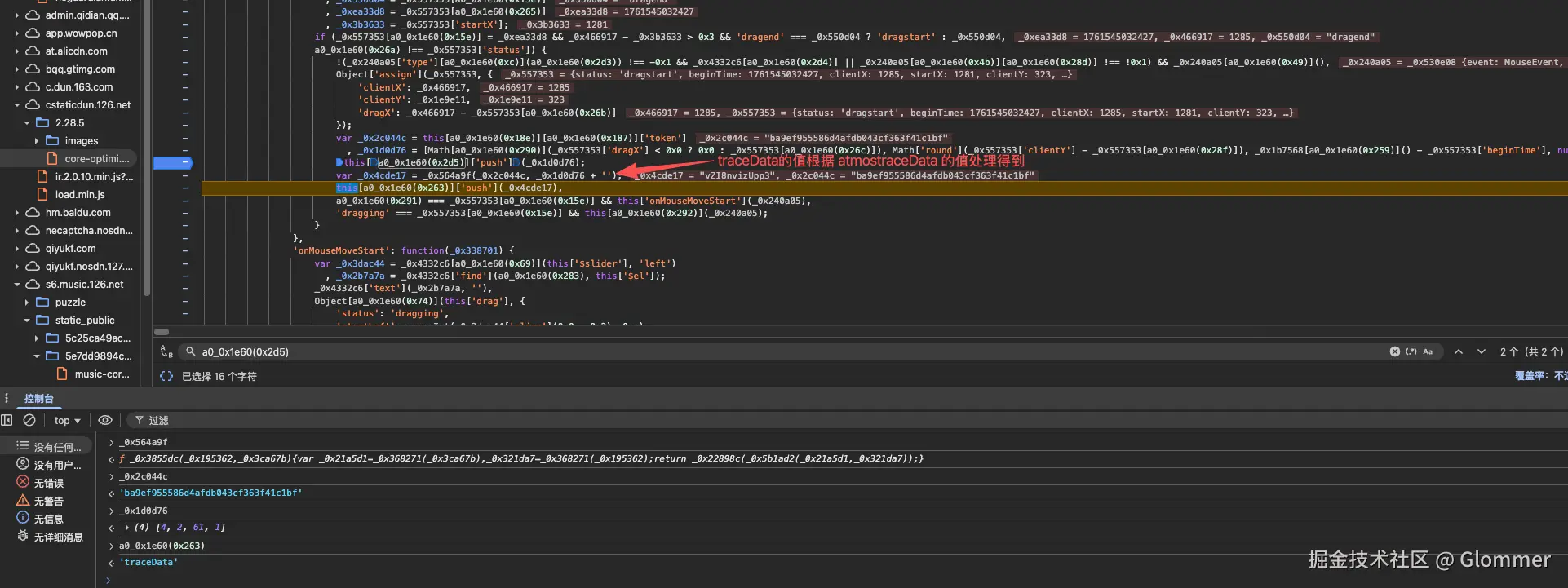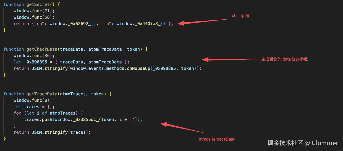 继续分析, 可以知道, traceData 的值是通过 atmosTraceData 中的数组以及 token 值经过 _0x564a9f 函数加密得到。到此, 我们基本可以确定接下来的处理思路了。