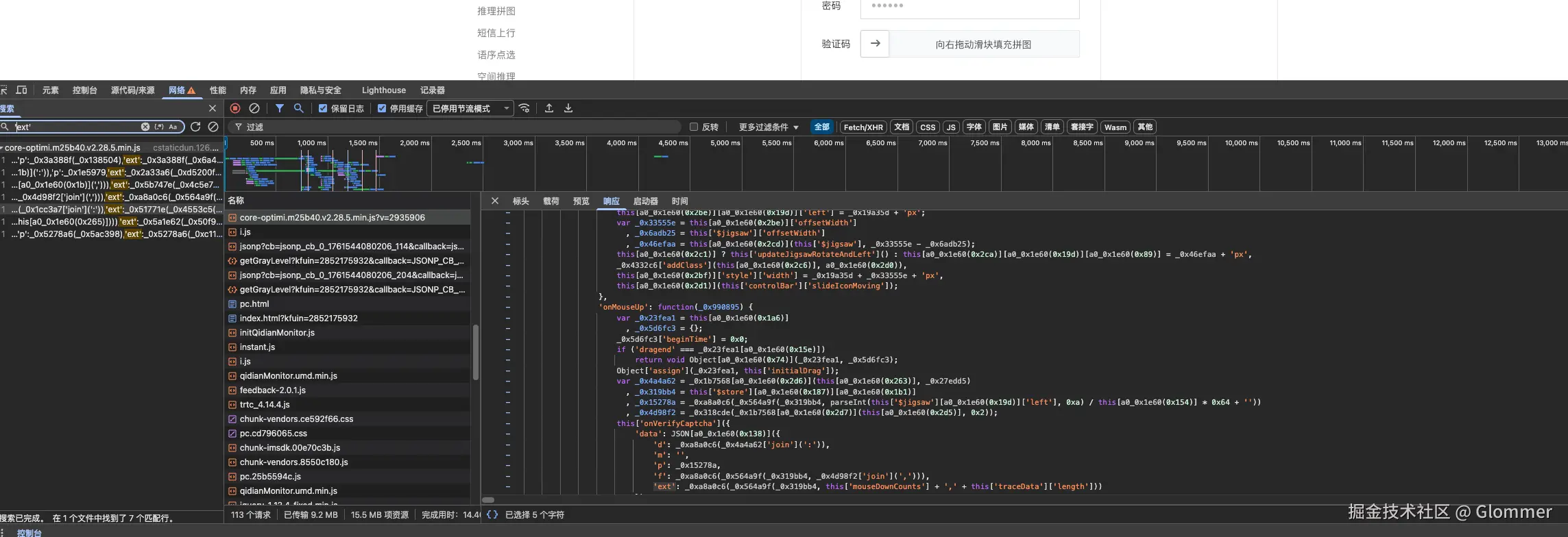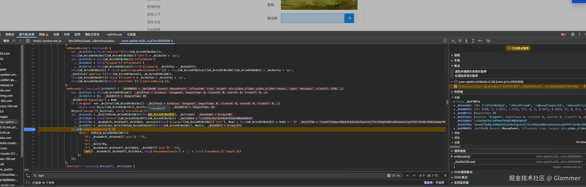 还是老方法, 先尝试全局搜索参数。因为 data 字段在响应中会出现, 导致会干扰搜索结果, 这里尝试搜索了 data 中的字段 ext , 将所有出现的位置都打上断点。