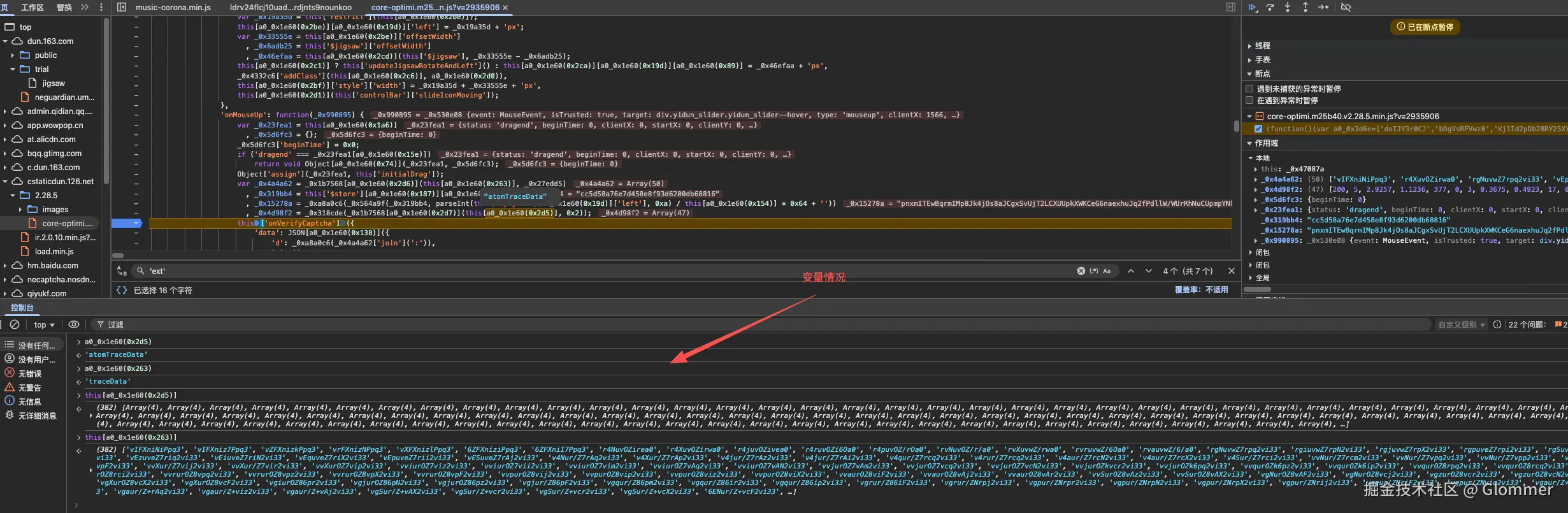 分析断点处代码, 会发现这是一个 mouseUp 的监听事件, 也就是说在我们鼠标抬起时出触发的事件。他通过对 this["traceDta"]、this["atomTraceData"]、token 等变量处理来得到最终的 data 值, 通过查看我们基本可以确定这两个数组就是我们的轨迹内容, 接下来就是确定如何生成两个数组。