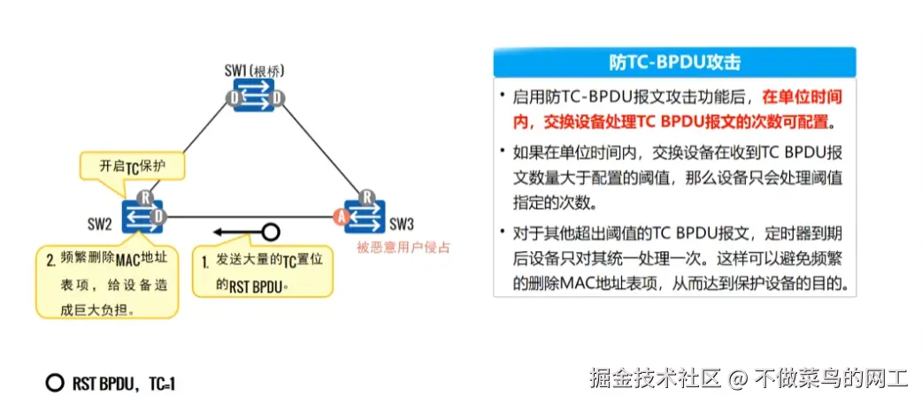 - 限定一定时间内处理tc报文的个数 默认处理TC-BPDU时间为2秒 个数为1