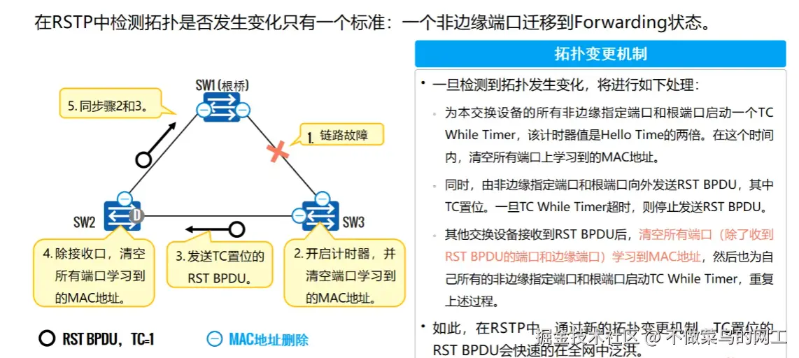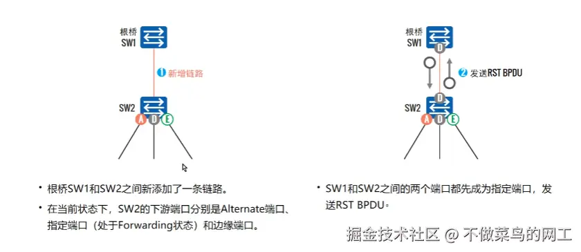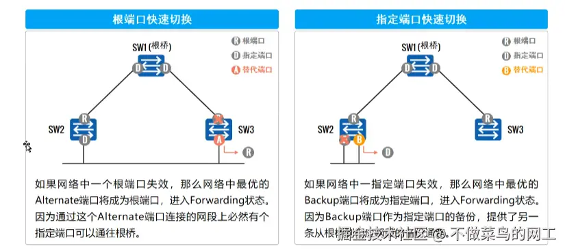 | 端口角色 | 3种: • 根端口 • 指定端口 • 阻塞端口 | 4种: • 根端口 • 指定端口 • 替代端口 • 备份端口 | 关键改进 :增加了"替代端口"和"备份端口"。它们相当于备用端口 ,预先计算好替代方案。当根端口或指定端口失效时,可以立即切换,无需重新计算。 |