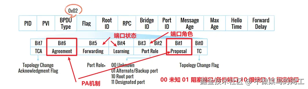 RSTP配置BPDU充分利用STP报文中的Flag位置 明确端口角色 除了保证和STP格式基本一致外,RSTP做了如下变化:
