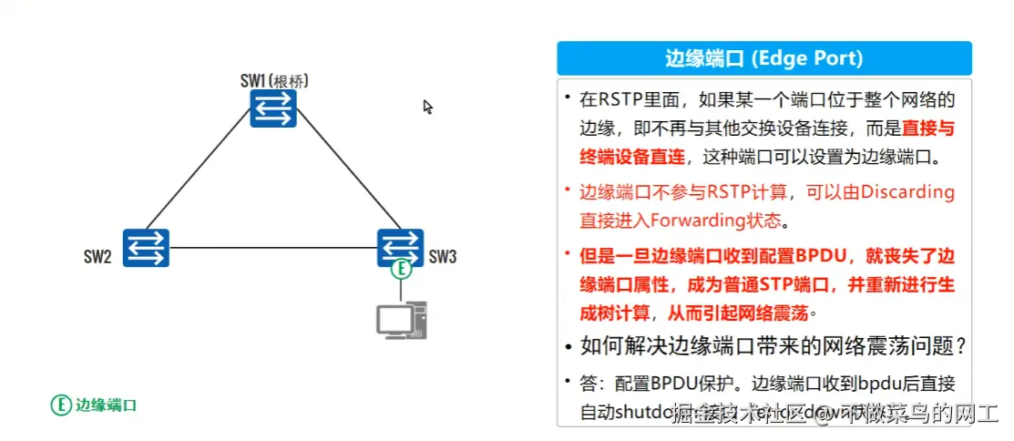 - 边缘端口不参与RSTP计算 直接进入Forwarding状态 但是一但接收到BPDU报文 就会丧失BPDU边缘端口属性 成为STP端口 重新进行生成树计算 导致网络震荡