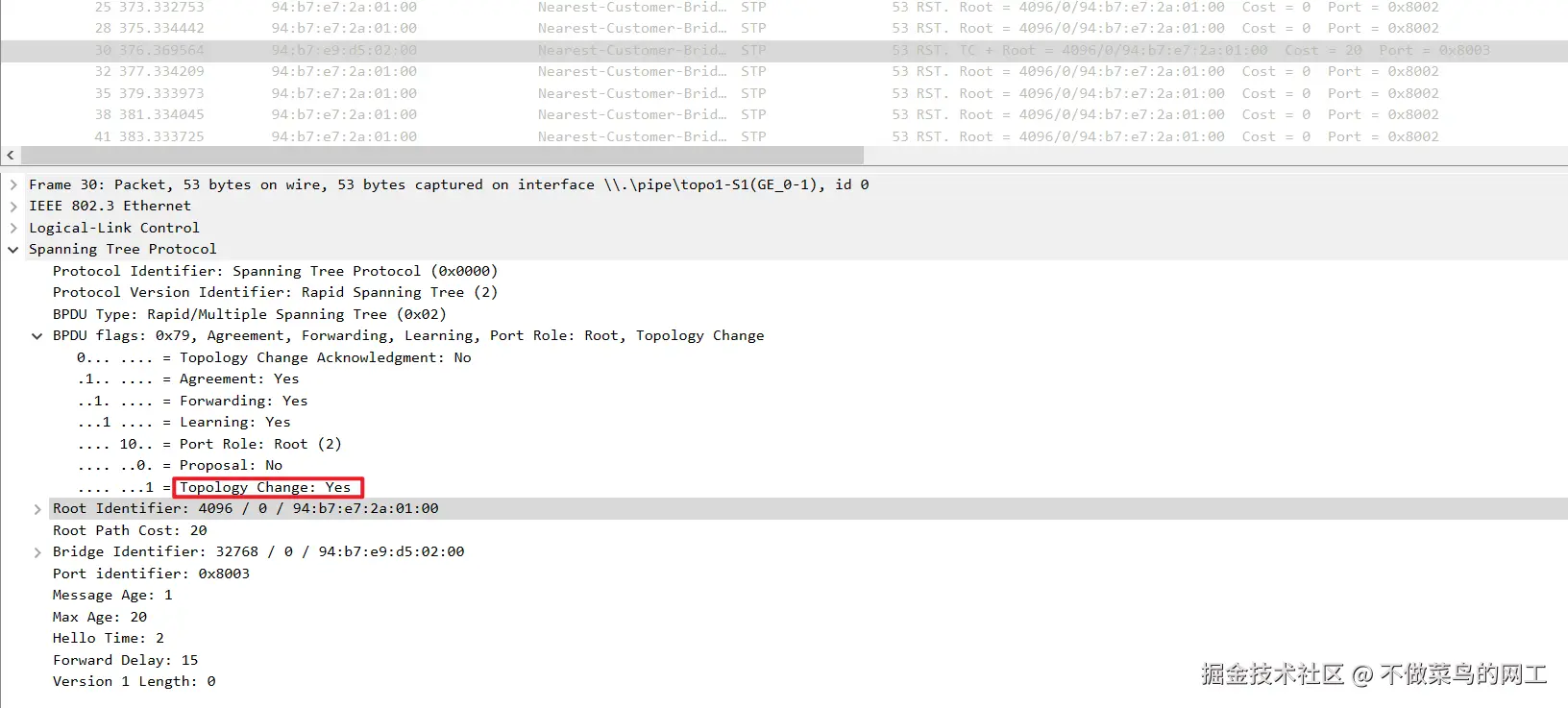 - 一个非边缘端口(阻塞端口)变为Forwarding状态 即拓扑发生改变