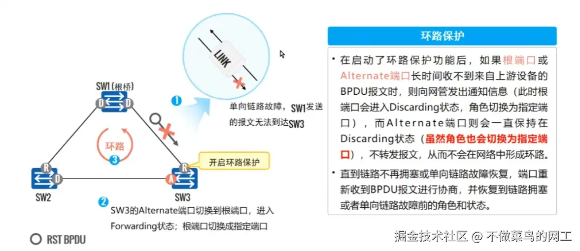 开启环路保护功能后 如果在指定时间没有接收到上游交换机的bpdu报文 则直接进入Discarding状态