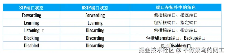 RSTP的状态规范缩减为3种,根据端口是否转发用户流量和学习MAC地址来划分