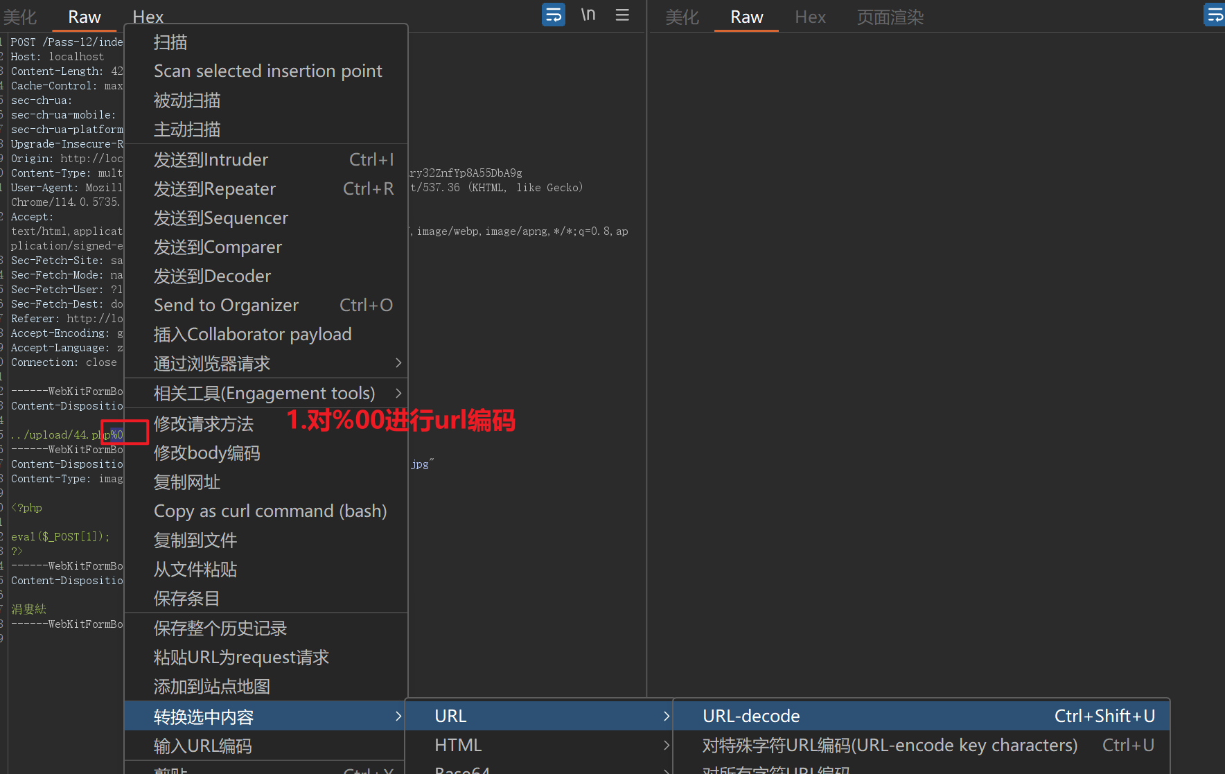 第十二关和第十一关是差不多的,只不过是接受值变成了post,这两者的差别呢就是get会自行解码,post不会自行解码,我们需要对%00进行编码,选中%00,右键进行url编码,如下图进行URL-decode。
