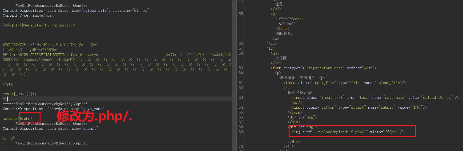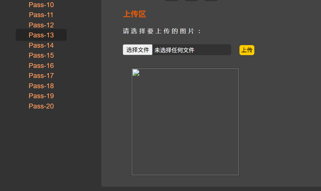 由于这关会检测文件后缀名,所以利用数字绕过的形式,拼接起来上传,即upload-20.php/.png 。