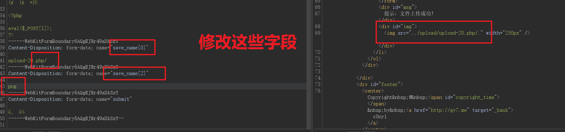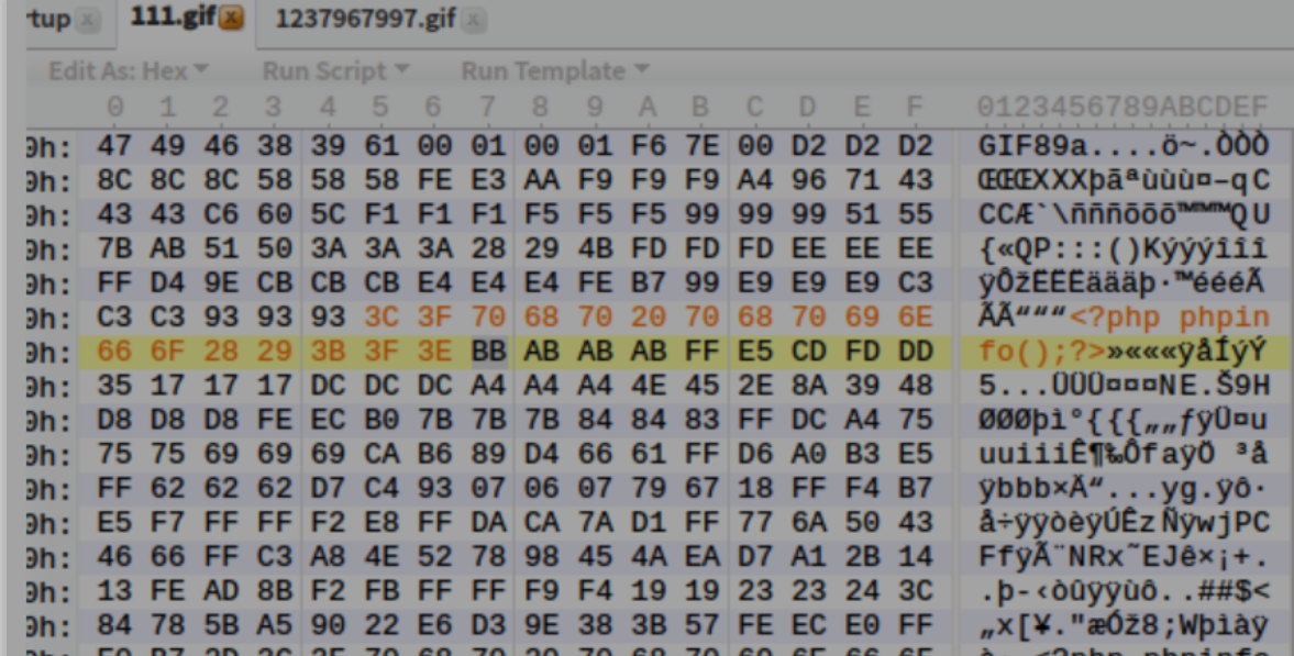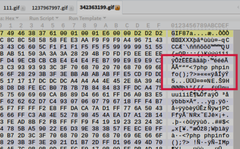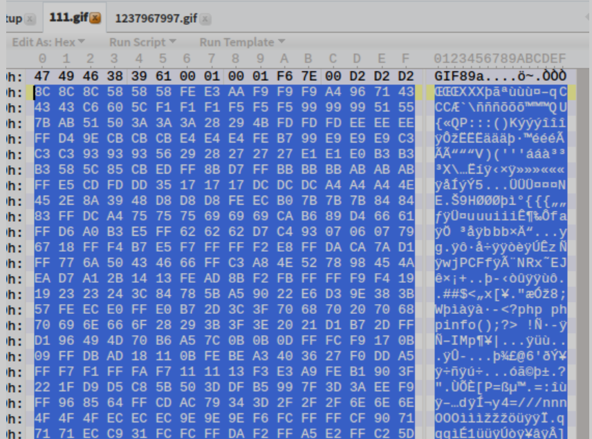 关于绕过对gif图片的二次渲染,我们只需要找到渲染前后没有变化的位置,然后将php代码写进gif里,就可以成功上传带有php代码的图片了。