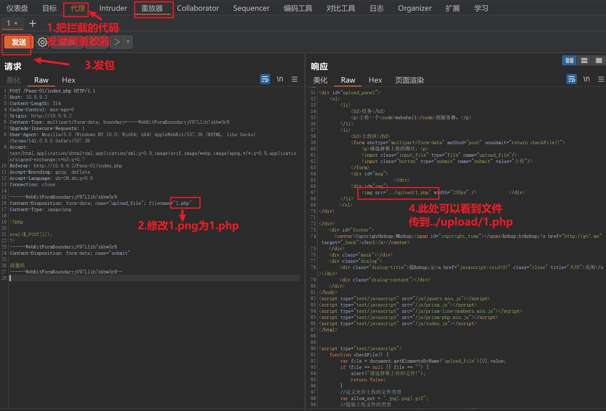 使用burpsuite工具抓包,上传一个含一句话木马的图片,然后直接修改content-type字段,将文件后缀名改为.php,然后点击"发送"即可完成上传。
