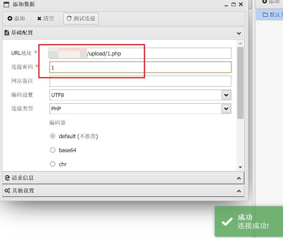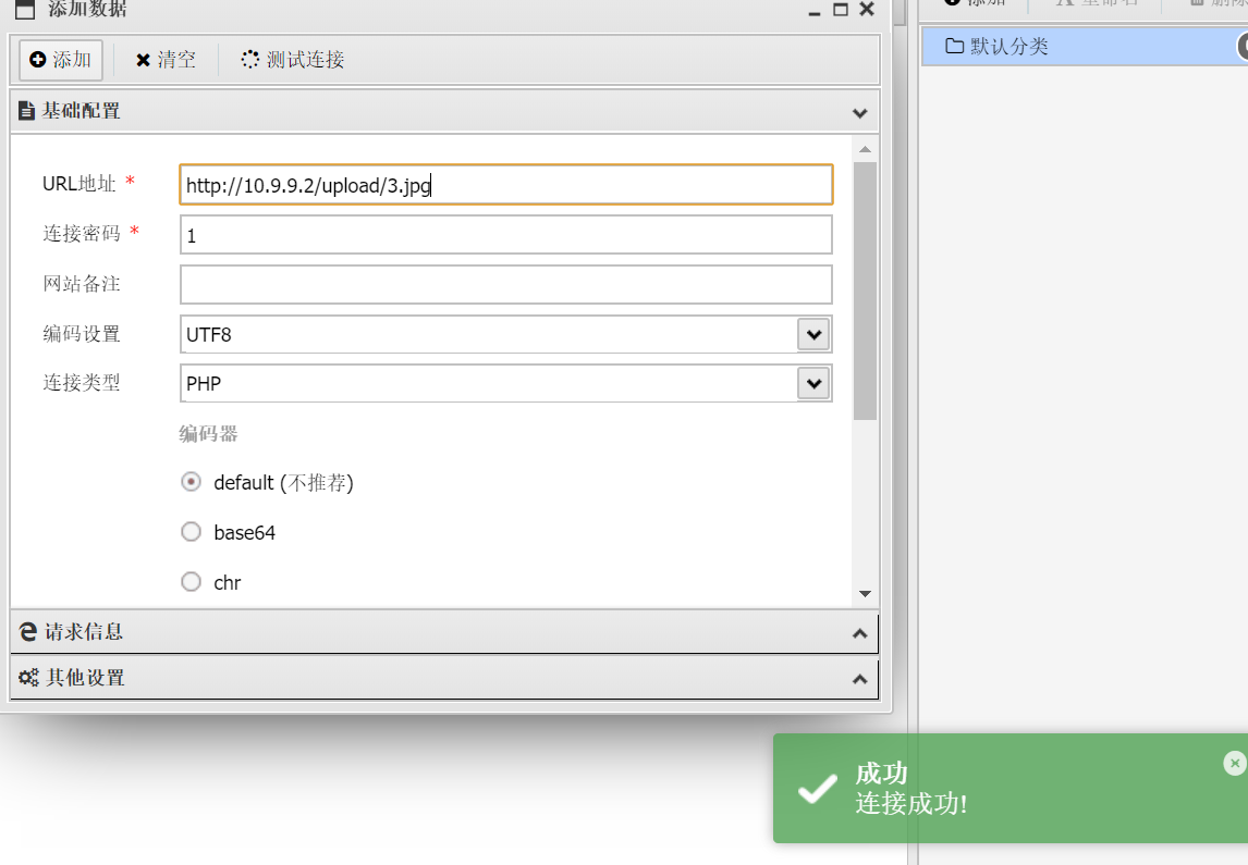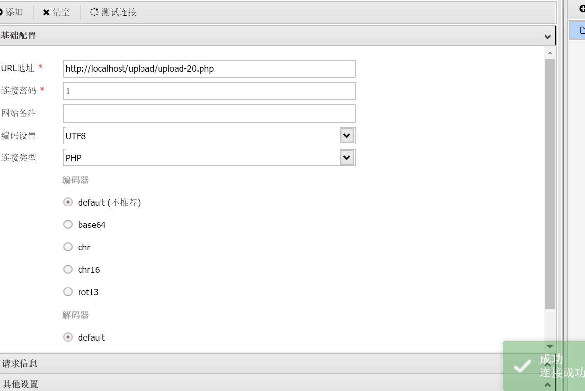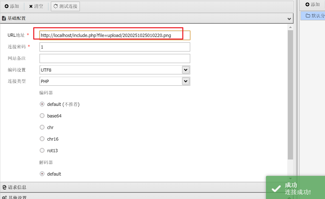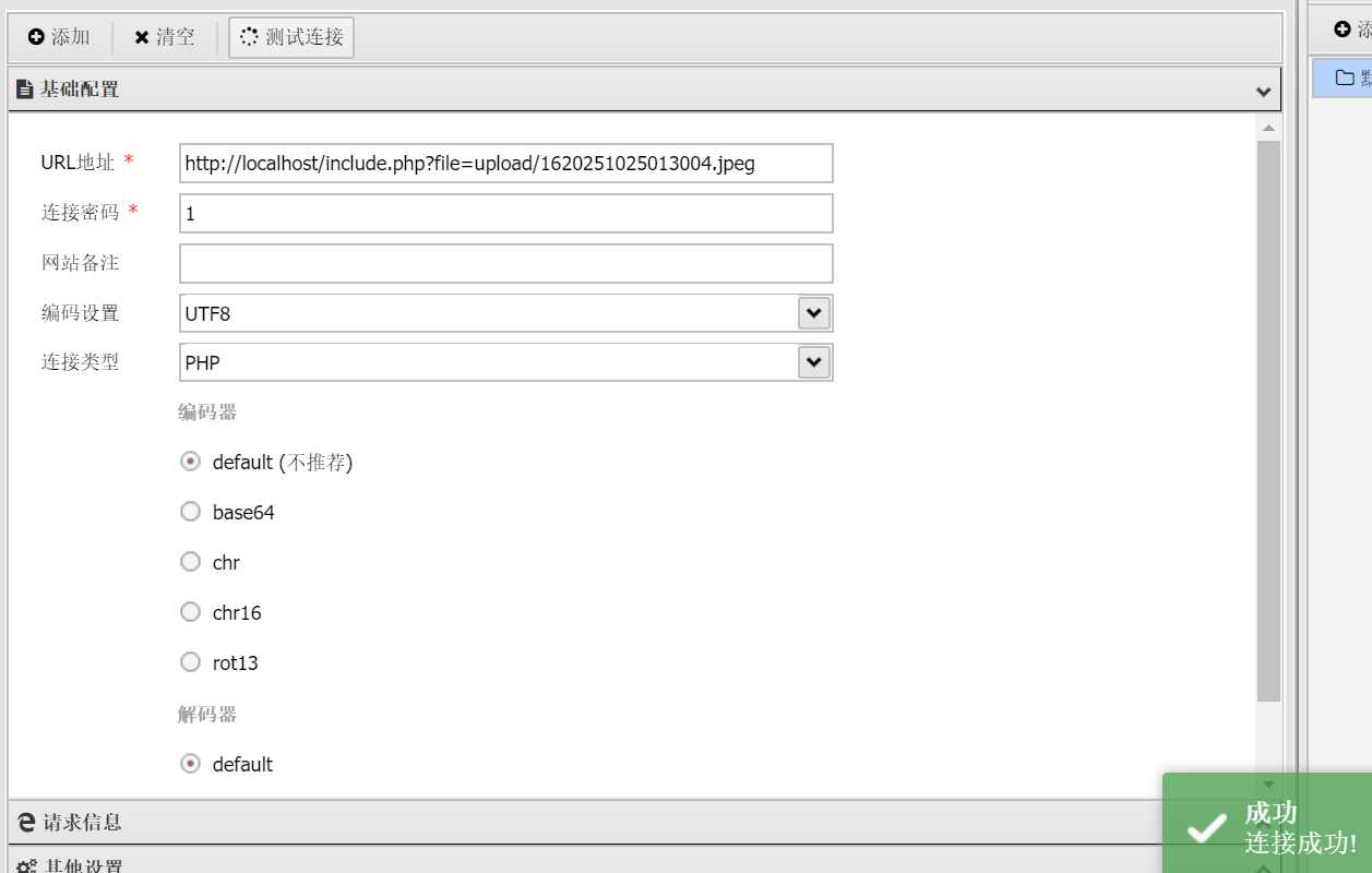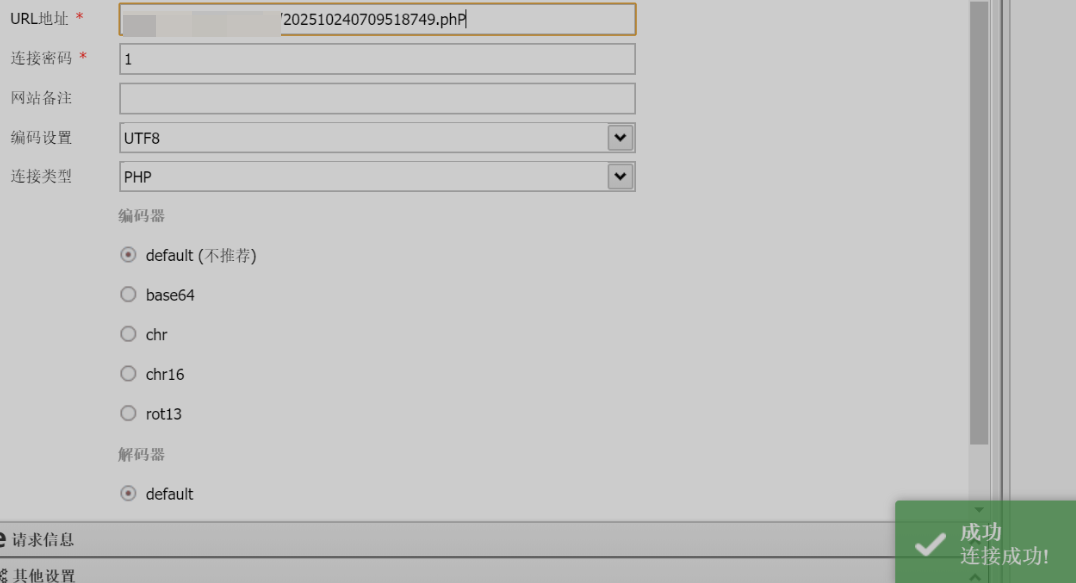 通过竞争关系,此时在上传目录中就会出现webshell.php,从而帮助蚁剑连接。
