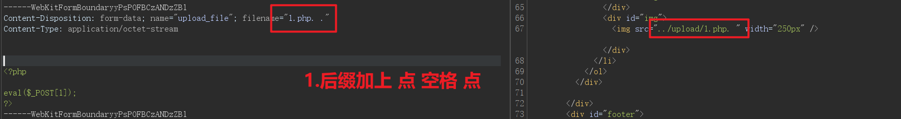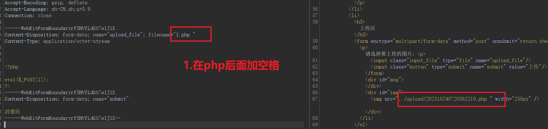 直接看源代码,发现没有对上传的文件收尾去空,所以可以在php文件后缀加空格。