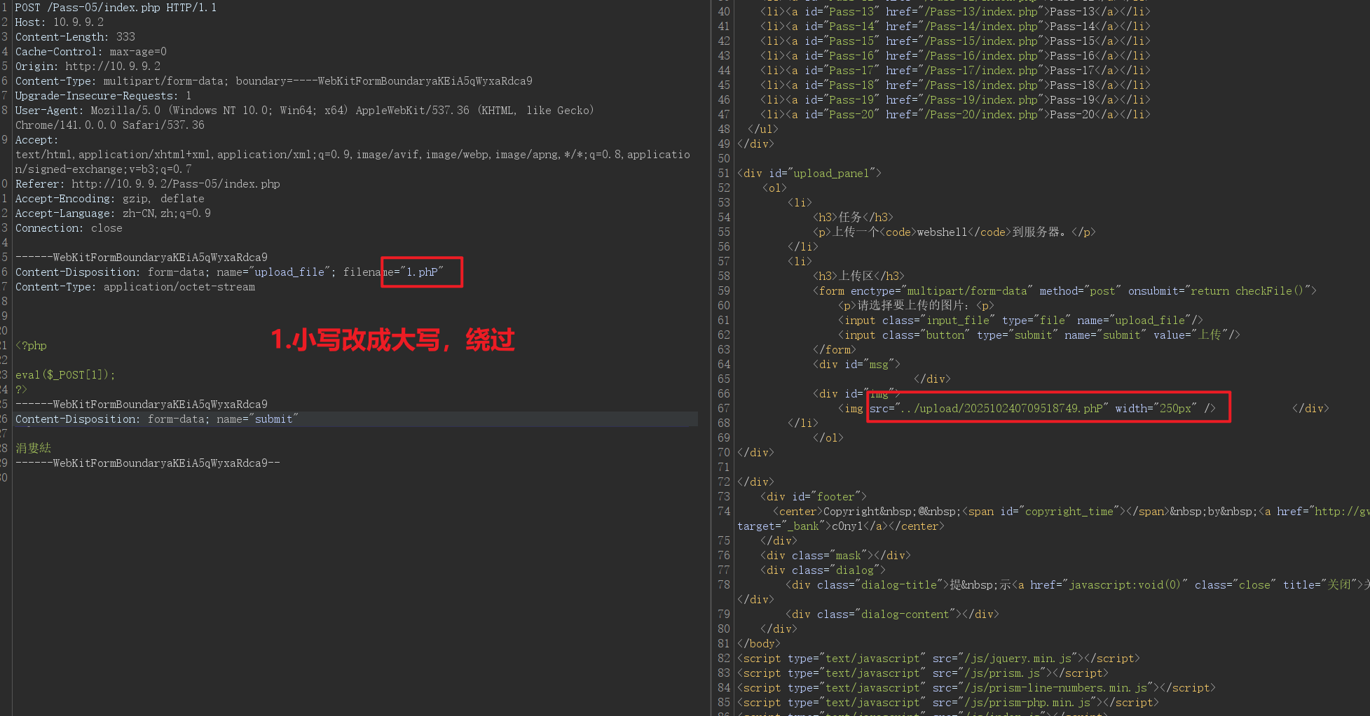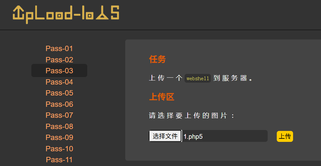 在某些特定环境中某些特殊后缀仍会被当作php文件解析 php、php2、php3、php4、php5、php6、php7、pht、phtm、phtml。我们这里用.php5试一下,可以发现直接上传成功 。