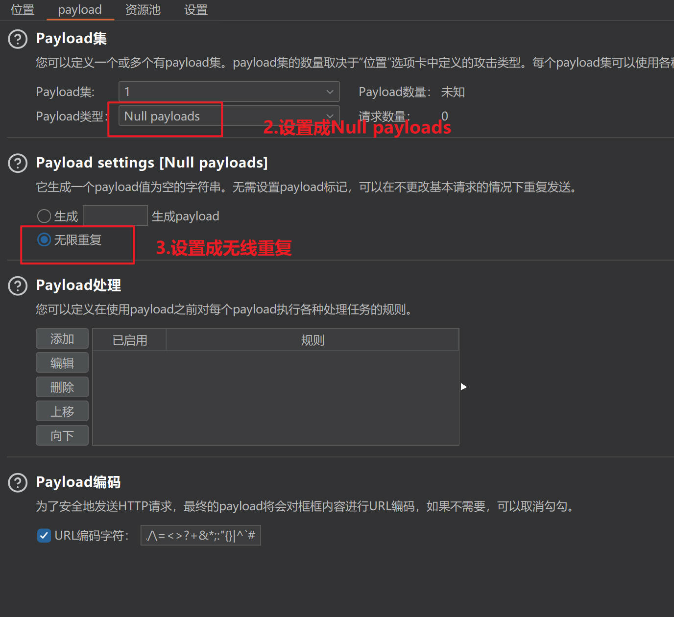 在payload设置中,选择Null payloads ,并设置成无限重复。