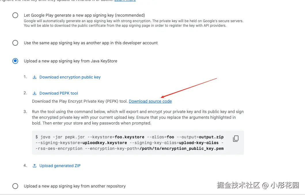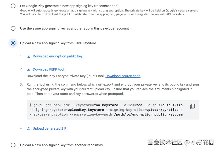 /Library/Java/JavaVirtualMachines/openjdk-22.0.2/Contents/Home/bin/java -jar /Users/xxx/Downloads/pepk-src/pepk-tool.jar --keystore=你要更新的keystore.keystore --alias=你的别名 --output=output.zip --signing-keystore=你要更新的keystore.keystore --signing-key-alias=你的别名 --rsa-aes-encryption --encryption-key-path=/Users/xxx/Downloads/encryption_public_key.pem