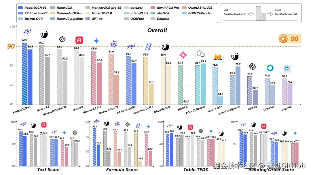 在权威榜单 OmniDocBench 中,它以 92.6 分获综合性能全球第一,四大核心能力全线 SOTA,超越 GPT-4o 等模型,刷新 OCR VL 模型性能纪录。