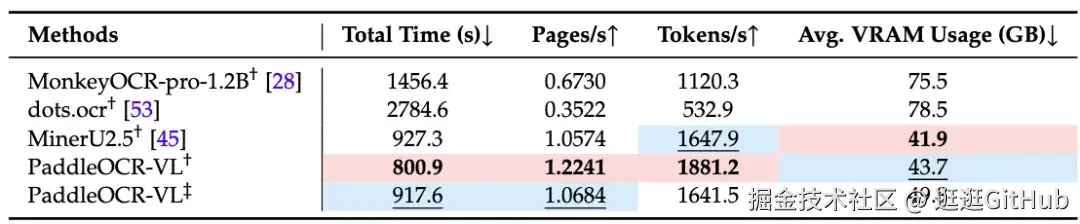 下表展示了不同文档解析模型在A100上的端到端推理速度。凭借轻量化的模型结构,PaddleOCR-VL每秒可处理 1881 个Token,推理速度较MinerU2.5提升14.2%,较 dots.ocr 提升253.01%。在当前主流开源多模态 OCR 方案中,PaddleOCR-VL 展现出显著的速度优势。