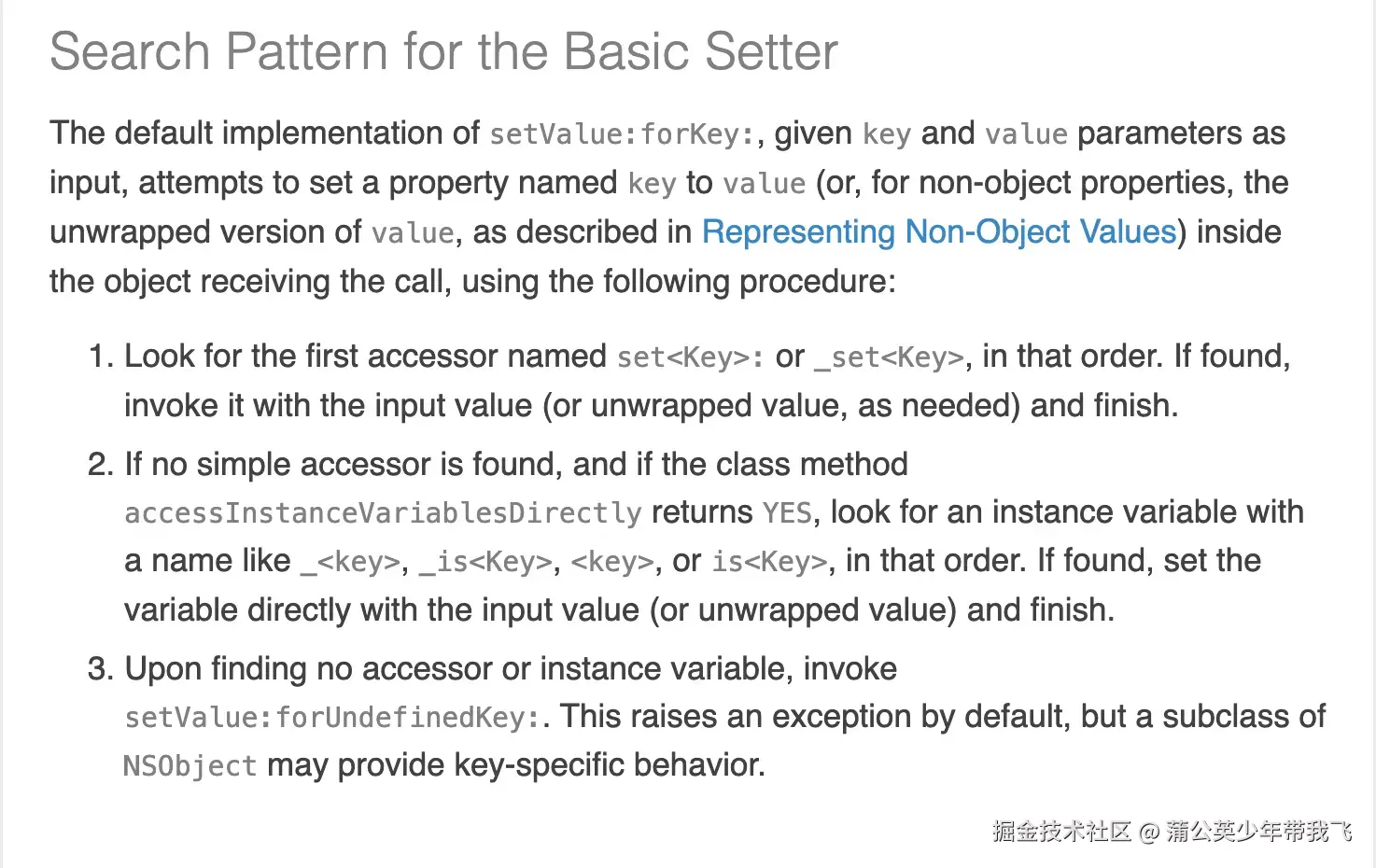 accessInstanceVariablesDirectly返回YES,那么寻找一个名称为_<key>、_is<Key>、<key>或is<Key>的实例变量,依次进行。如果找到了,直接用输入值(或解开的值)设置变量,然后完成。 -
