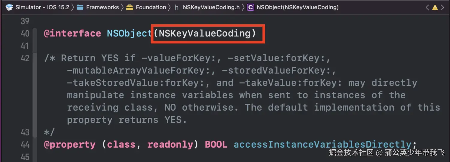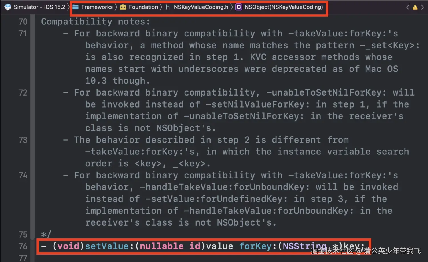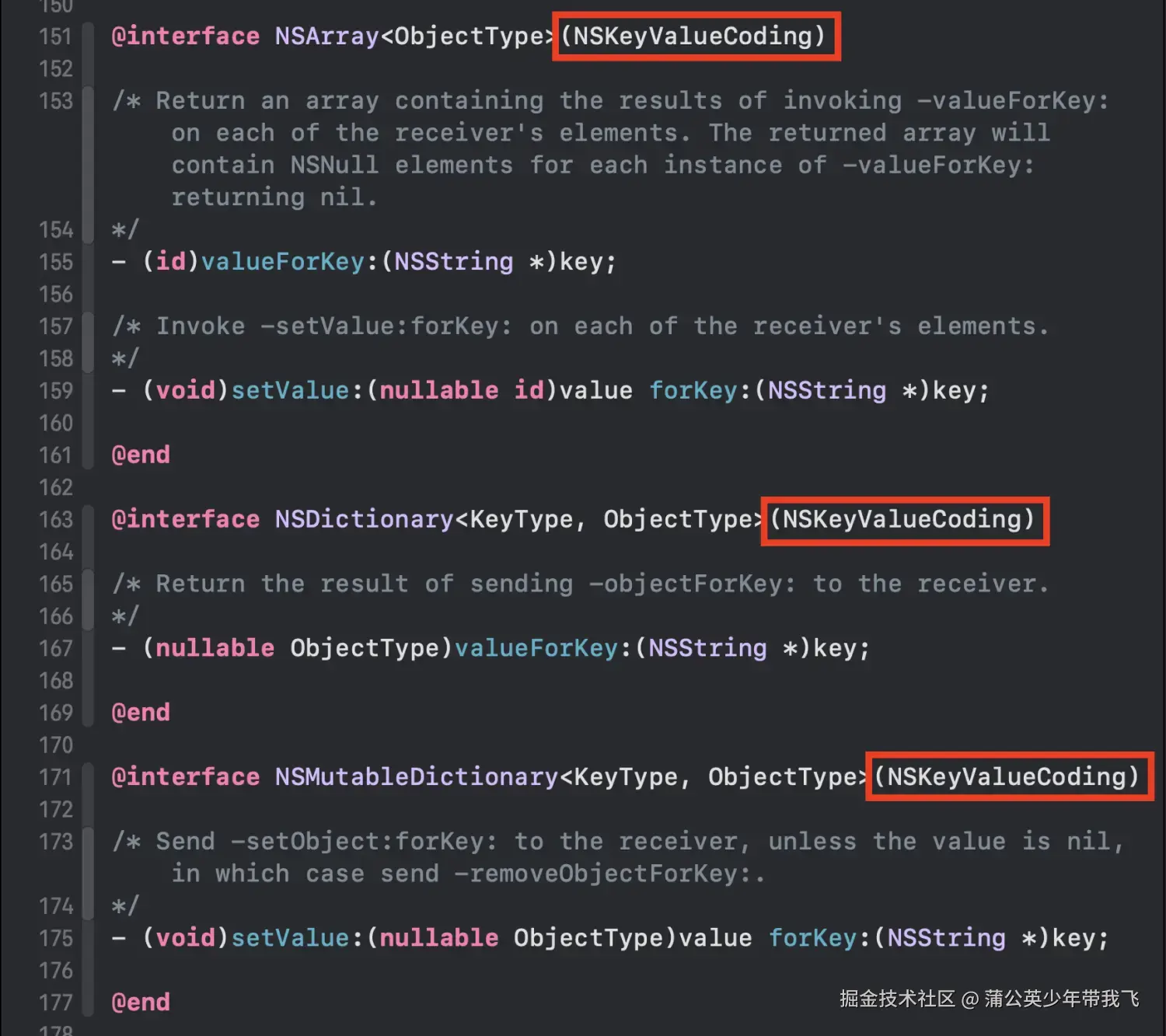 我们可以看到,它是在 Foundation 框架下,关于**NSObject、NSArray、NSDictionary等的一个 NSKeyValueCoding**的分类。其实这些内容在苹果的官方文档中解释的很清楚,小伙伴们可以自行查阅。Key-Value Coding Programming Guide