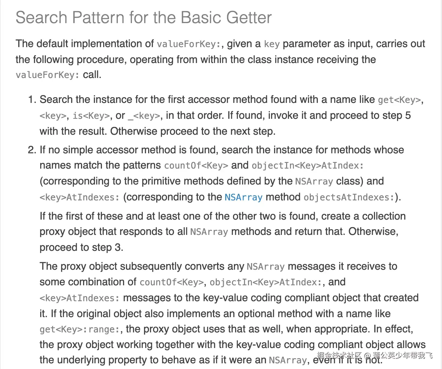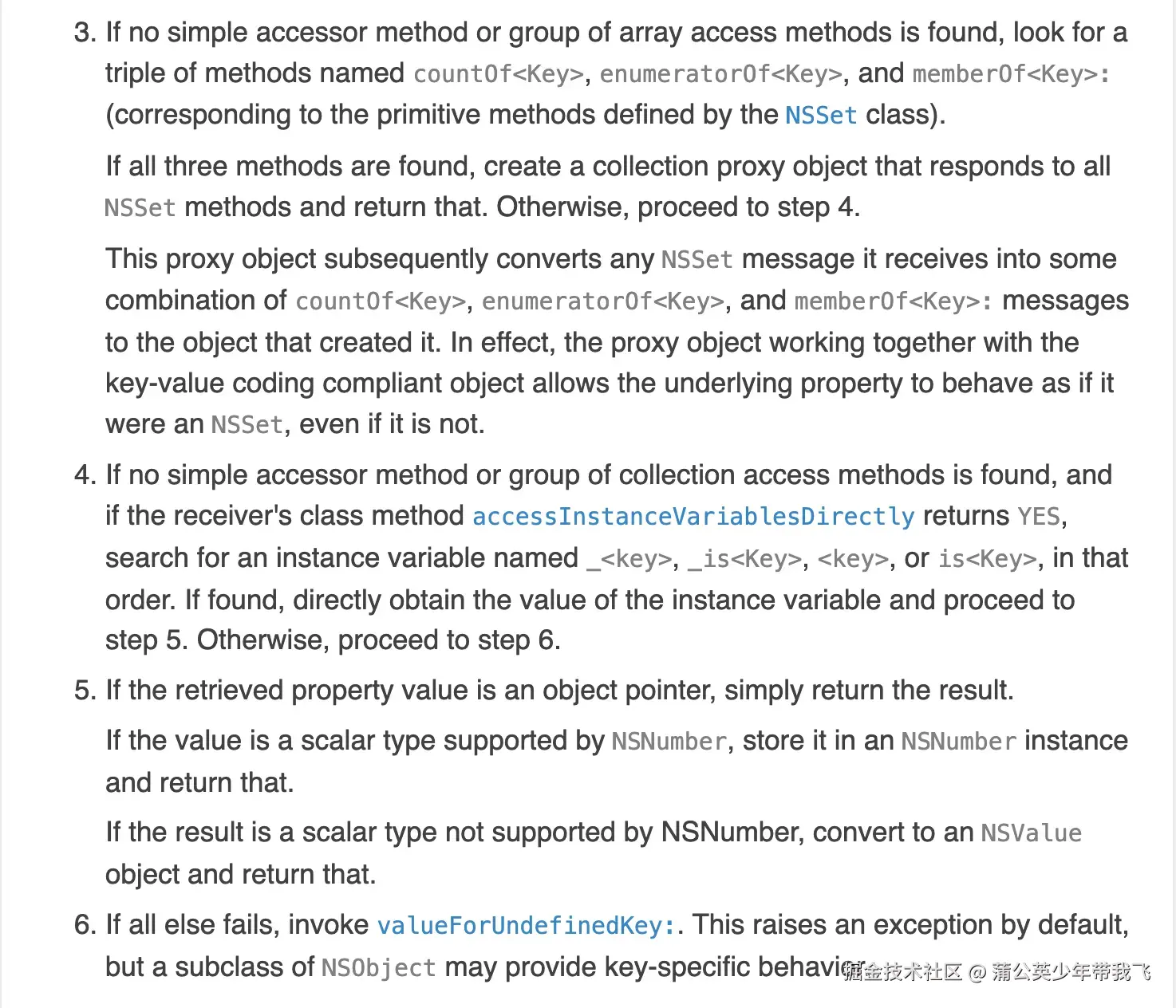 accessInstanceVariablesDirectly返回YES,搜索名为实例变量_<key>,_is<Key>,<key>,或者is<Key>,按照这个顺序。如果找到,直接获取实例变量的值并进行步骤5,否则进行步骤6。 -