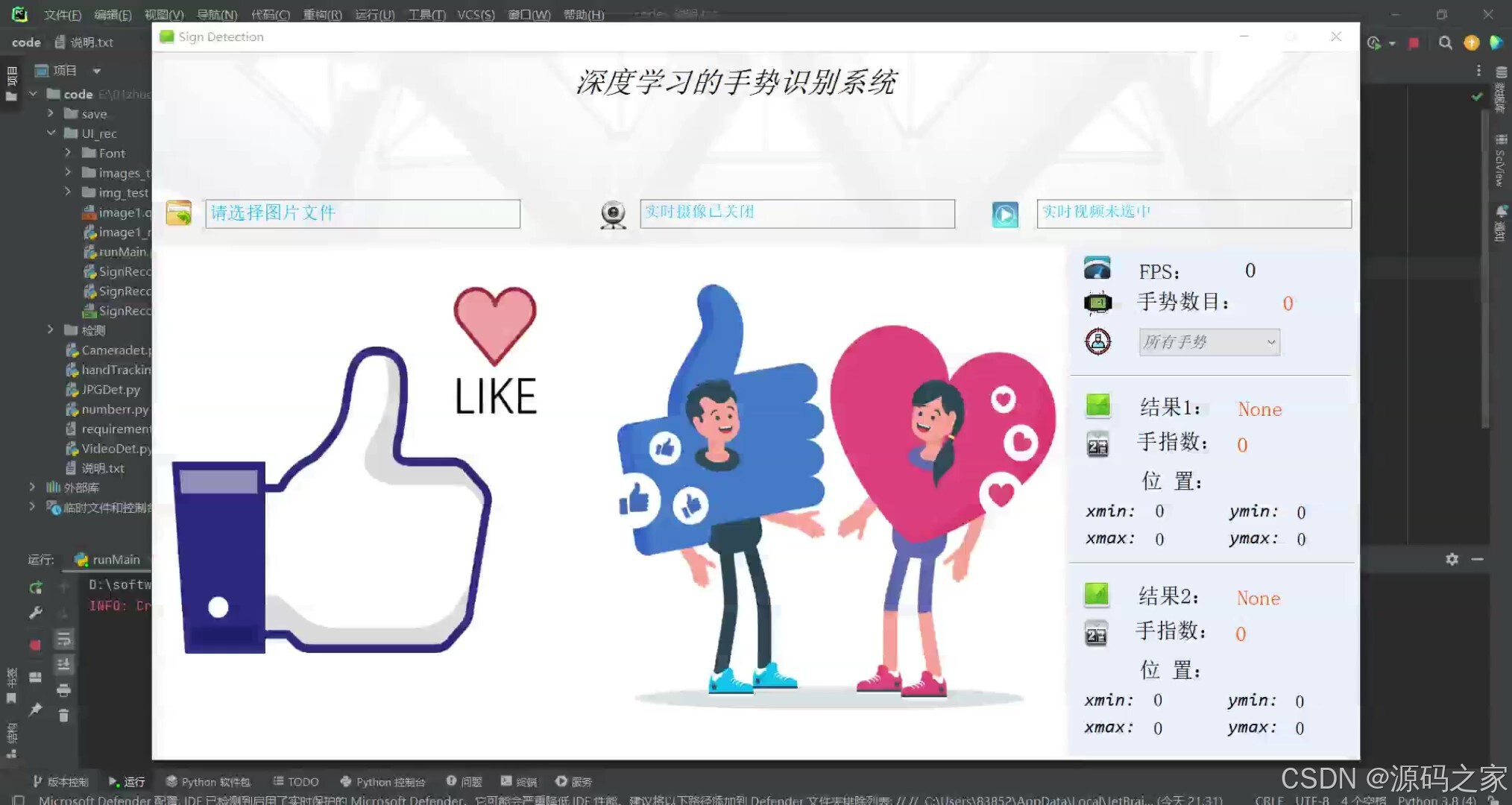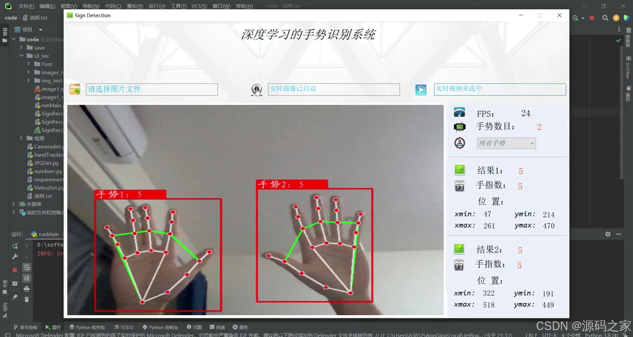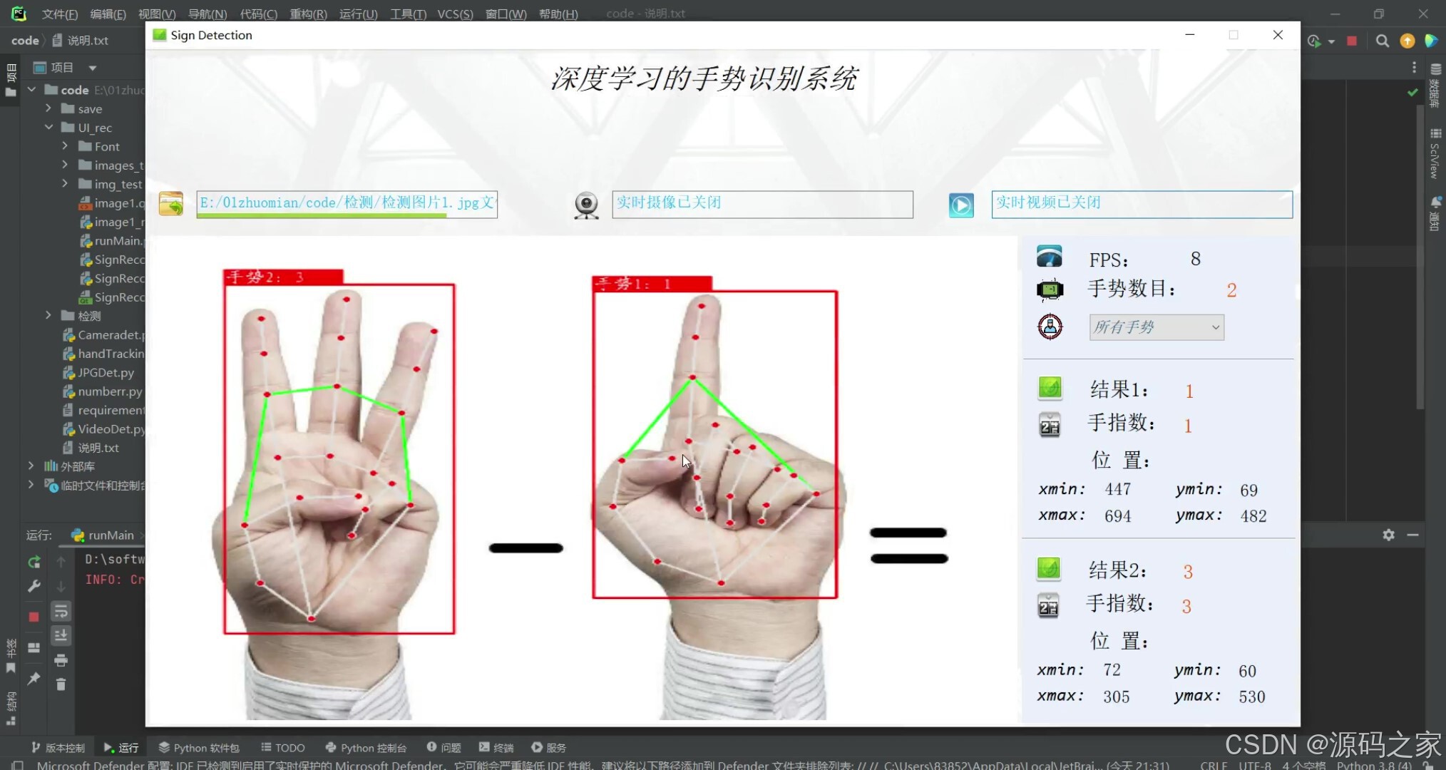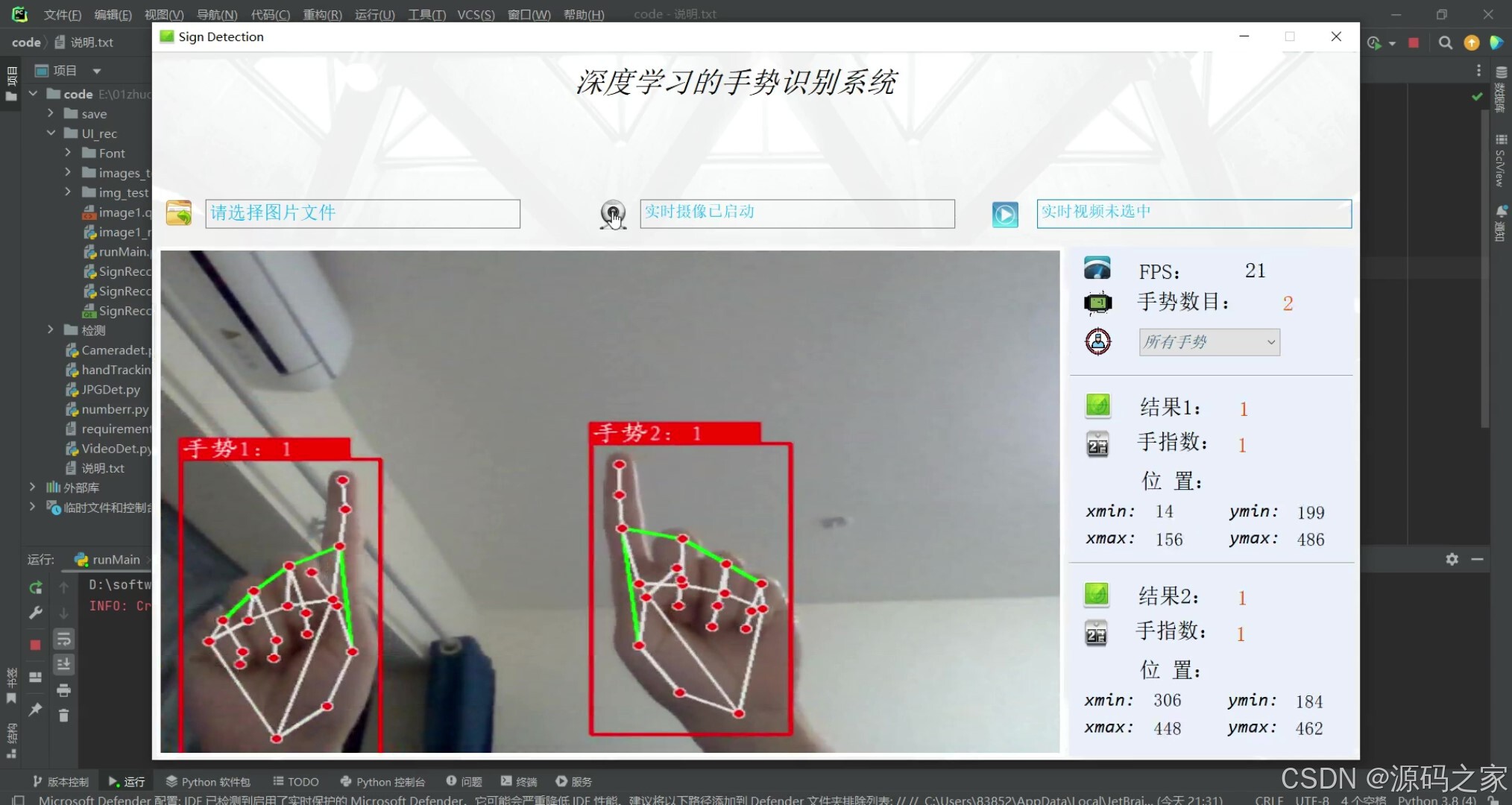 手势识别采用了基于MediaPipe的改进SSD算法,进行手掌检测后对手部关节坐标进行关键点定位;在系统界面中可以选择手势图片、视频进行检测识别,也可通过电脑连接的摄像头设备进行实时识别手势;可对图像中存在的多个手势进行姿势识别,可选择任意一个手势显示结果并标注,实时检测速度快、识别精度较高。