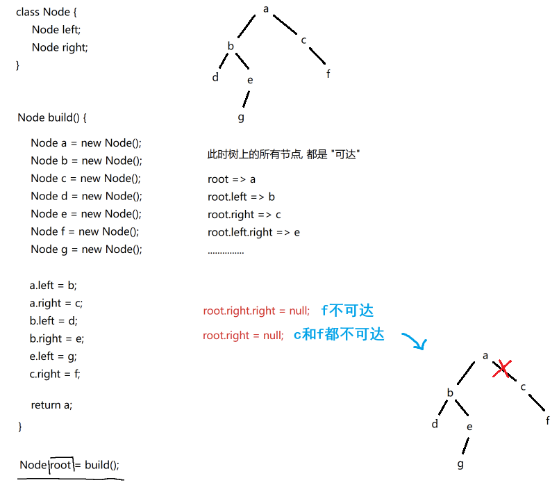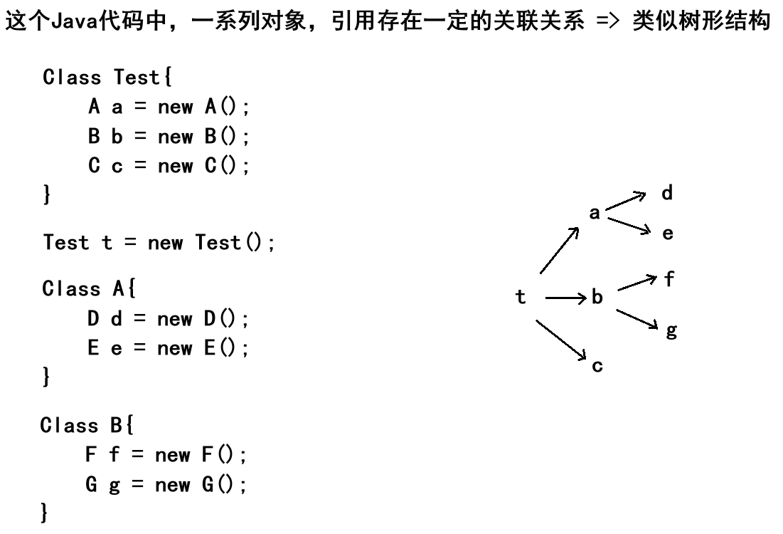 可达性分析,就是从树根节点出发(根节点可能有多个),尝试遍历这个对象树,遍历过程中凡是经过的对象,都标记成 "可达"。另一方面,JVM自身知道自己一共都有哪些对象,除去可达的,剩下的就是 "不可达"(当成垃圾回收了)。随着代码的运行,对象之间的引用关系是实时变化的,上述可达性分析需要周期性进行。