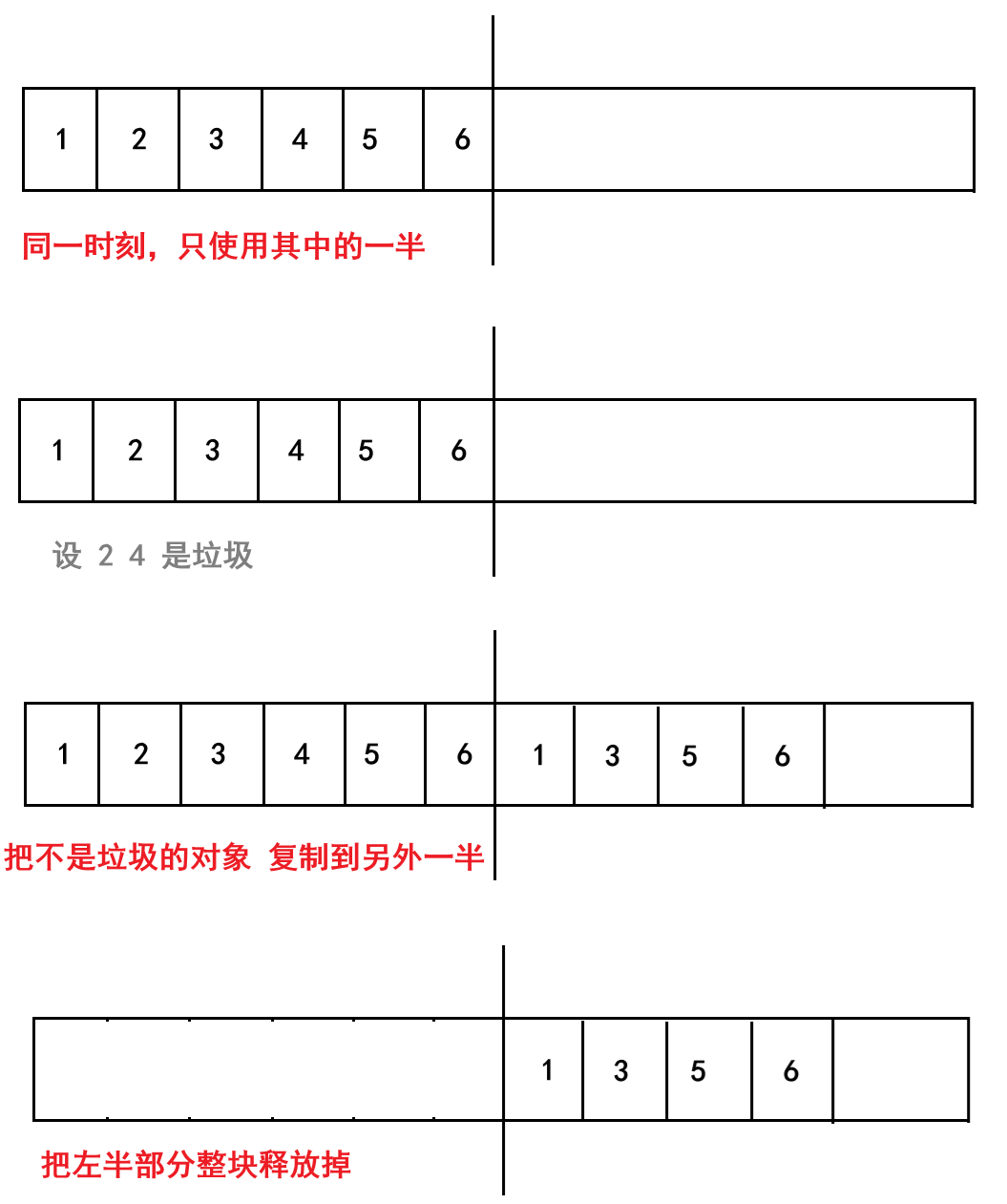 缺点:1. 空间利用率很低(最多只能用到50%)2. 如果当前存活的对象很多,复制开销就很大