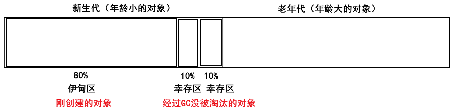 - 伊甸区对象经过第一轮GC的时候,把绝大部分淘汰掉(经验规律:大部分新对象的生命周期非常短 "朝生夕死"),没有淘汰的对象 通过复制算法进入到幸存区,幸存区有两个部分,每次只用其中的一部分。