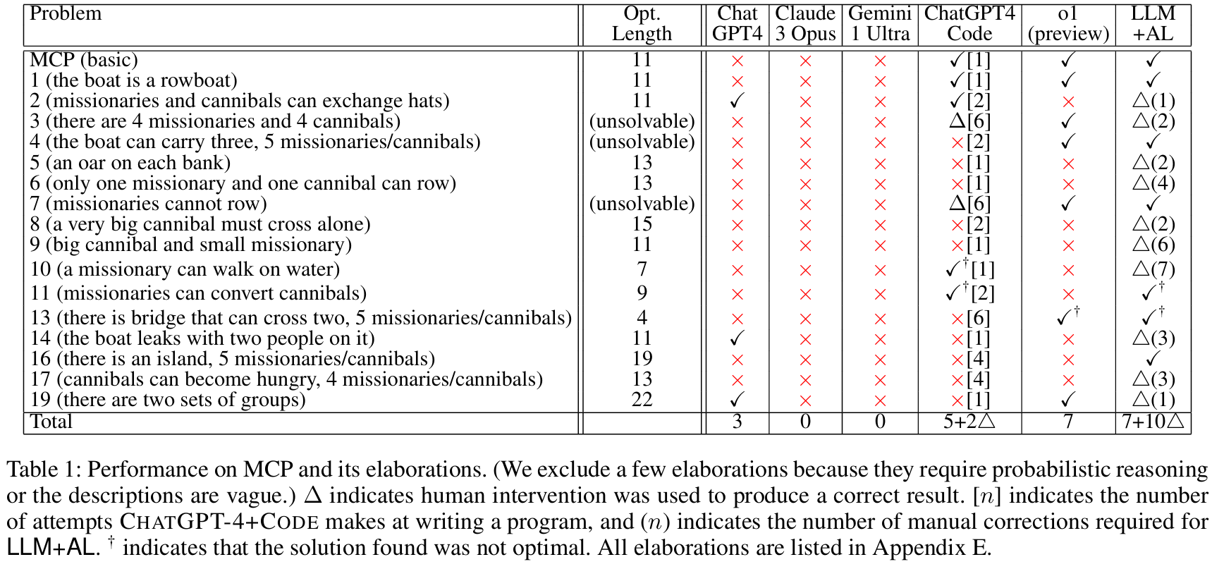 Table 1: 在 MCP 及其变体上的性能对比。✓ 表示成功,x 表示失败,Δ(n) 表示需要 n 次人工修正才能成功。LLM+AL (最后一列) 的性能显著优于所有基线模型。