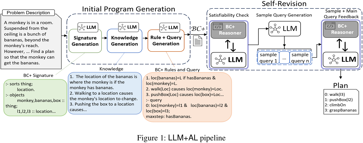 - 职责分离 (Separation of Concerns) : 将任务分解为两个部分。LLM 负责其擅长的语义理解和翻译 ,即将自然语言描述的问题转换为声明式的行动语言 BC+ 代码。符号求解器 (Symbolic Reasoner) 负责其擅长的部分,即在形式化知识的基础上进行高效、可靠的约束求解和规划搜索。