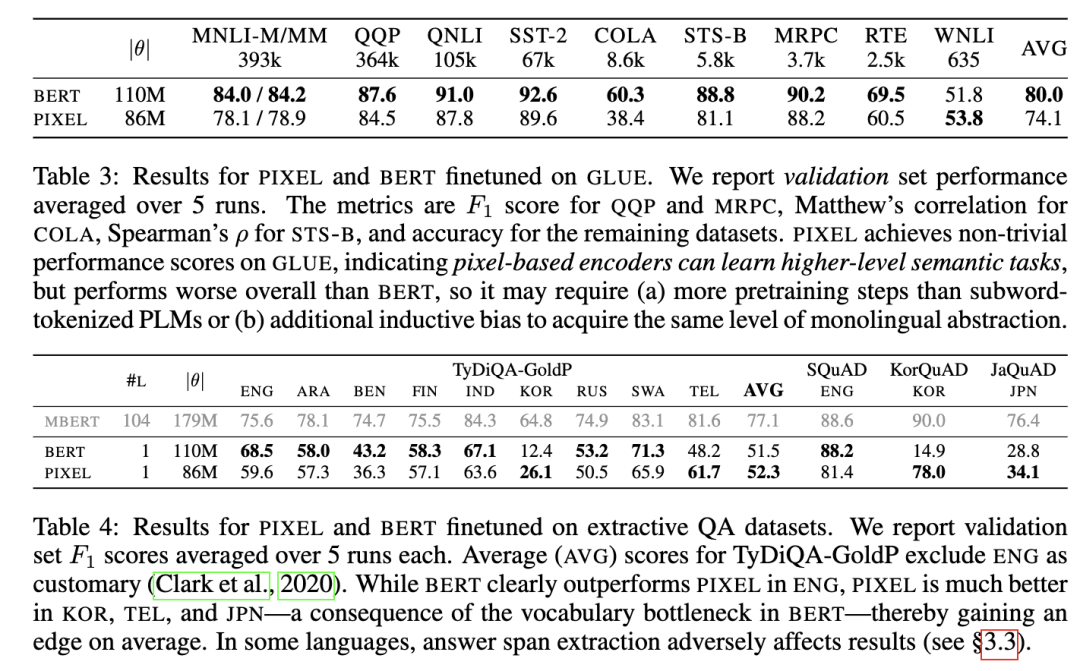 在英文 GLUE 任务上,PIXEL 虽略低于 BERT,但依然取得了良好表现;