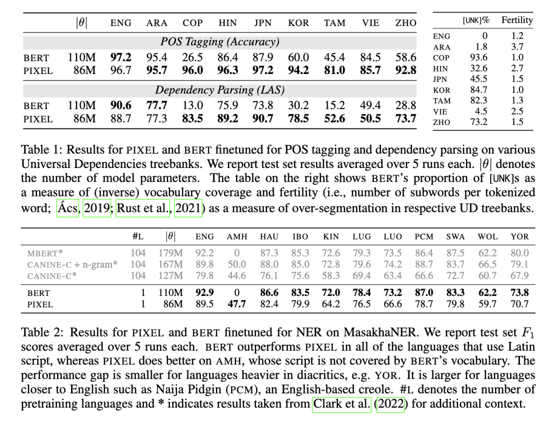 Coptic 语言 POS 准确率:BERT 仅 26.5%,PIXEL 高达 96%;