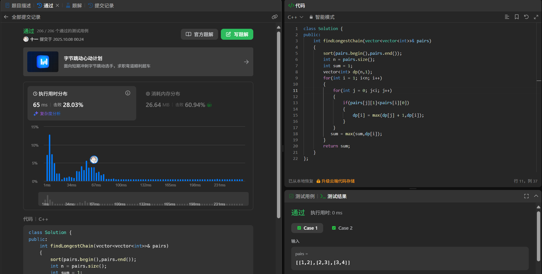 以i 为结尾 dp[i]表示以i位置为结尾的最长数对链