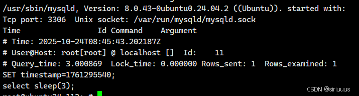 Query_time:SQL 执行时间(秒),此处为 3 秒,超过阈值 1 秒;