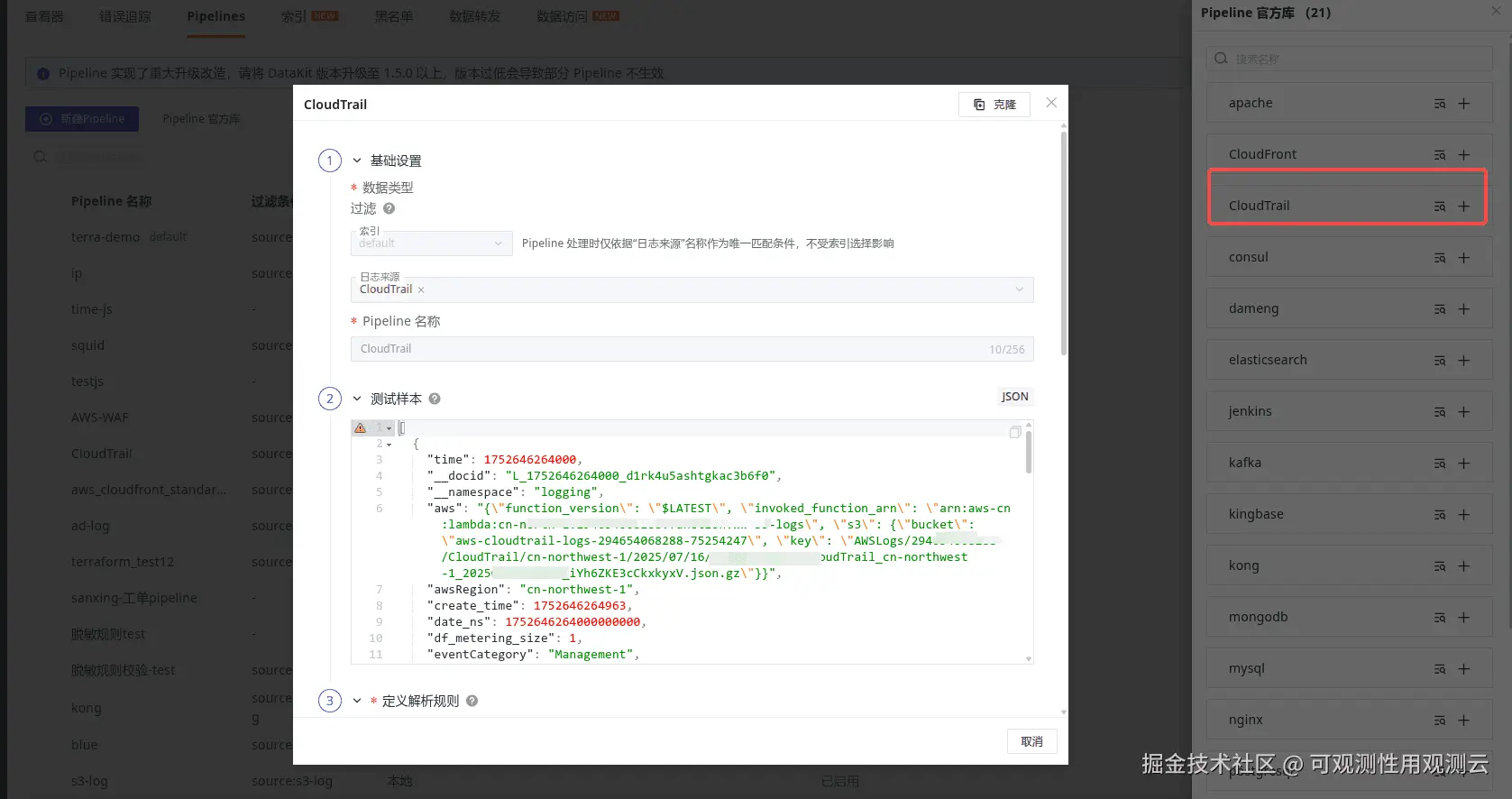 观测云已内置了 CloudTrail 日志解析,可以在【日志】 - 【Pipelines】 - 【Pipeline 官方库】 - 选择 CloudTrail ,添加类型为 中心 Pipeline,保存即可,对新上报数据生效。