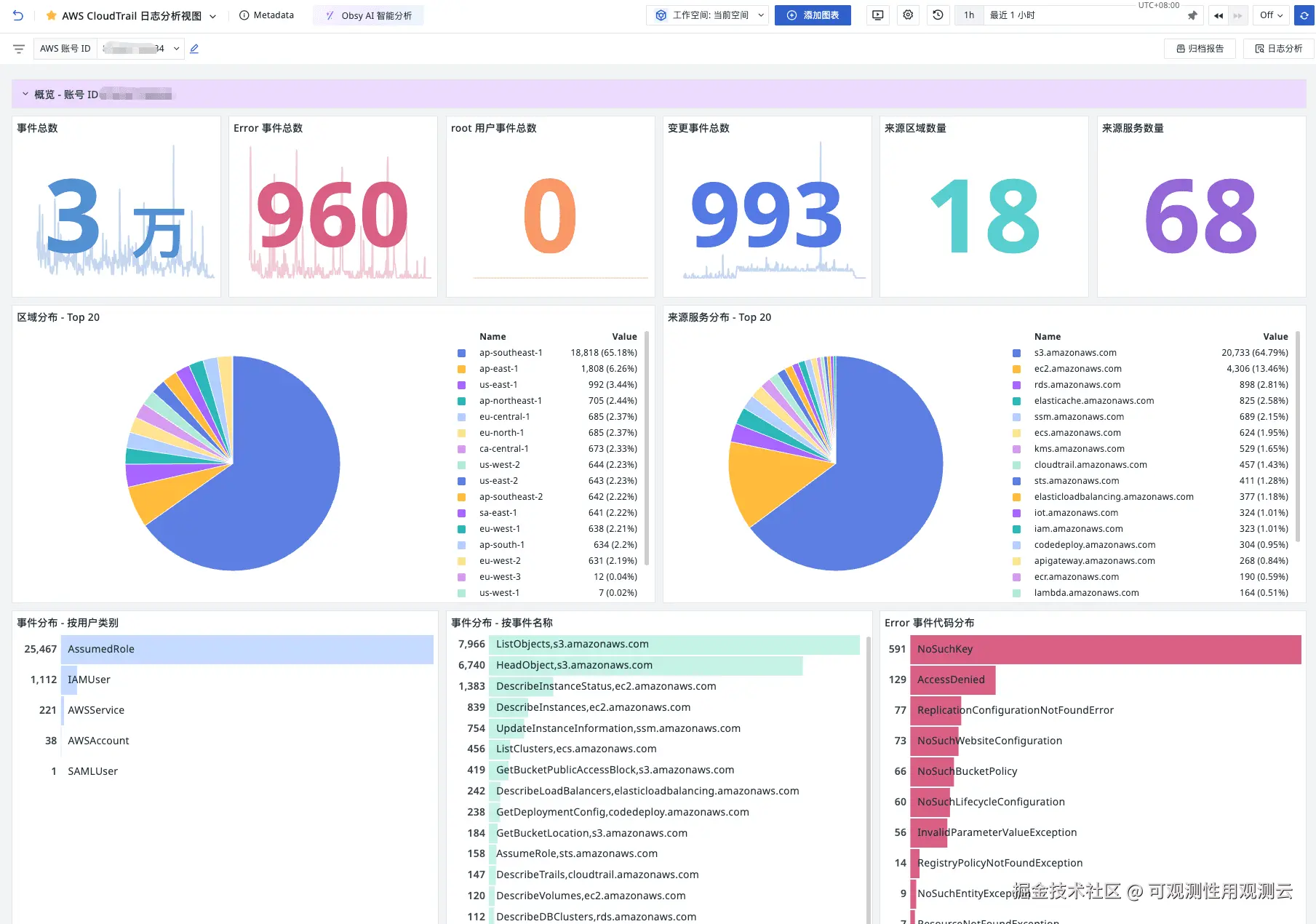 为了有效地进行安全审计、故障排查和合规性监控,AWS CloudTrail 日志分析视图重点关注基于以下资源类型的日志非常重要,因为大多数威胁都源自这些地方。您也可以根据自身的业务需求进行调整配置。