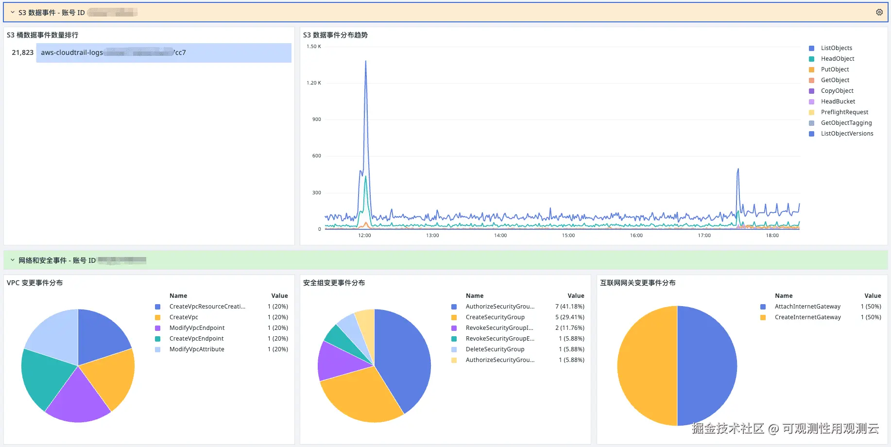 - 高危操作监控:例如,监控根用户(Root User)的登录或 API 调用、用户删除关键资源(如数据库、S3 存储桶)等。
