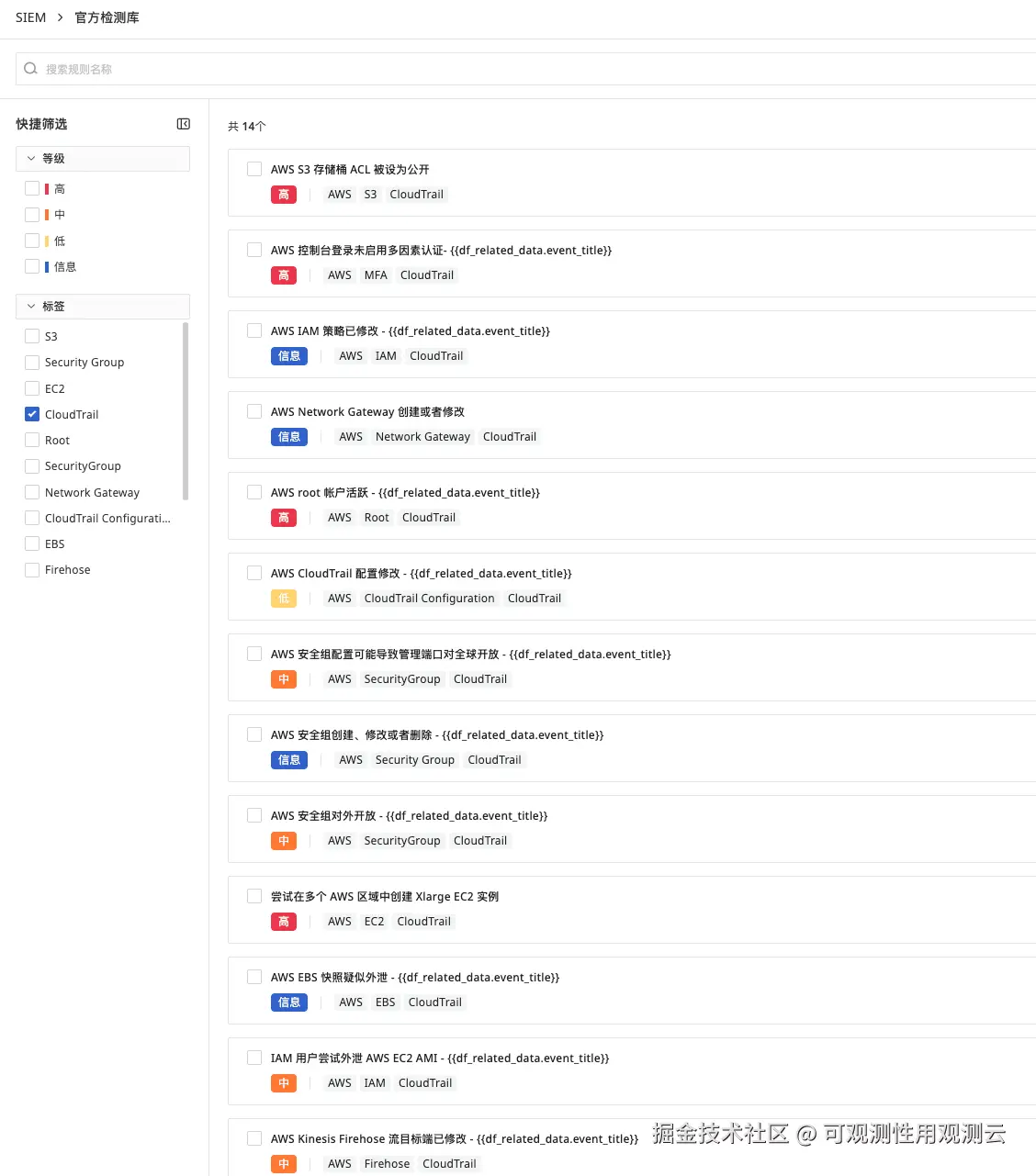 观测云提供了丰富的、基于最佳实践的内置安全规则,即官方检测库,涵盖了多种常见的安全威胁场景: