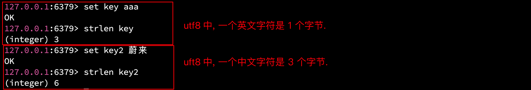 Redis 客户端的编码方式是 utf8, 在 UTF-8 编码中, 一个英文字符占 1 个字节, 而一个中文字符占 3 个字节.