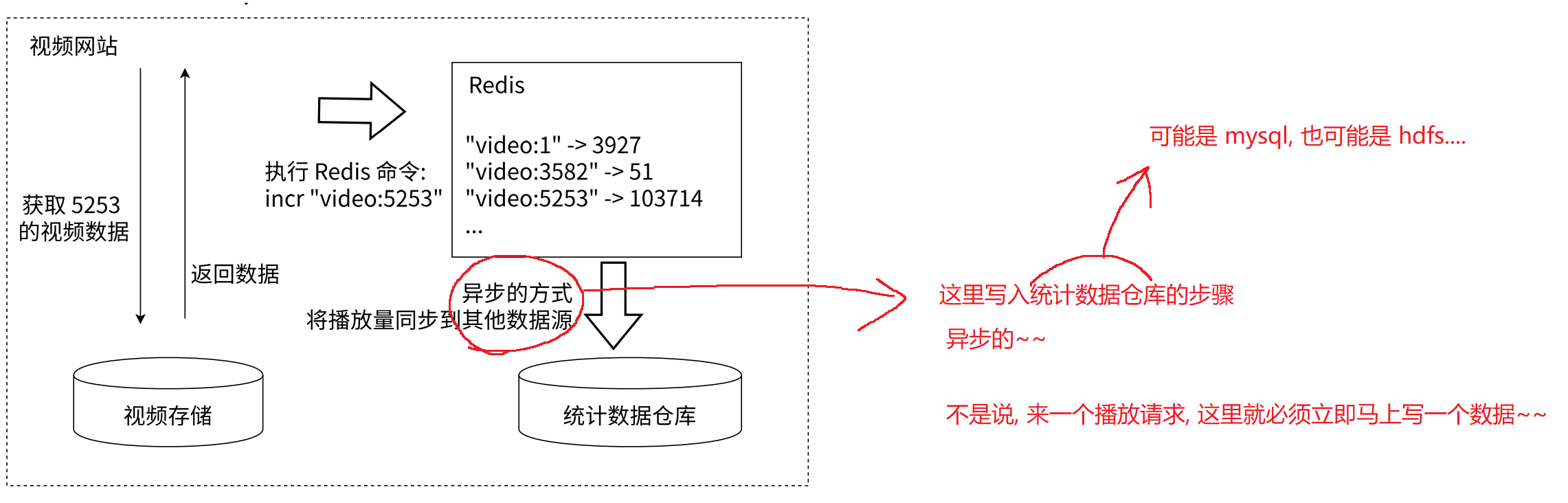 这里的异步是指, 当主程序(视频网站)在 Redis 中更新计数后, 就会立即返回(这个过程是很快的). 而数据从 Redis 写入数据库的这一步骤, 则交由一个后台程序去完成, 不阻塞为用户提供服务的核心流程. (因为写入数据库的过程较慢, 异步的方式就可以保证不影响用户体验)