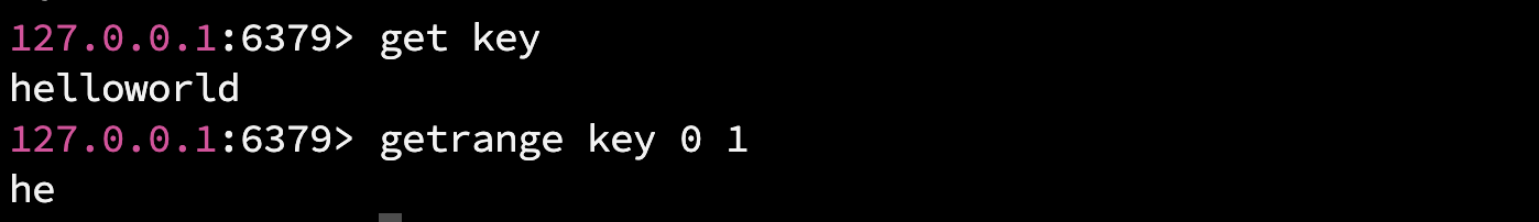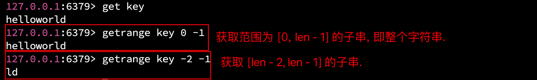 getrange 用于截取字符串的部分内容 , 类似于 Java 中的 substring 方法, 不同之处在于 Redis 的 getrange 是左闭右闭区间.