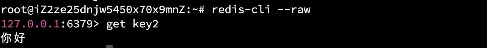 由于 Redis 展示的是汉字的十六进制形式, 不易观察. 因此, 在启动 Redis 客户端时, 可以加上 --raw 选项, Redis 客户端就会对二进制数据进行翻译, 将二进制数据返回为汉字: