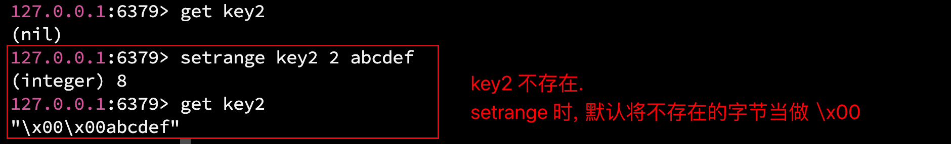 setrange 也可以操作不存在的 key , 但是会默认 offset 前的字节全是 '0x000' :