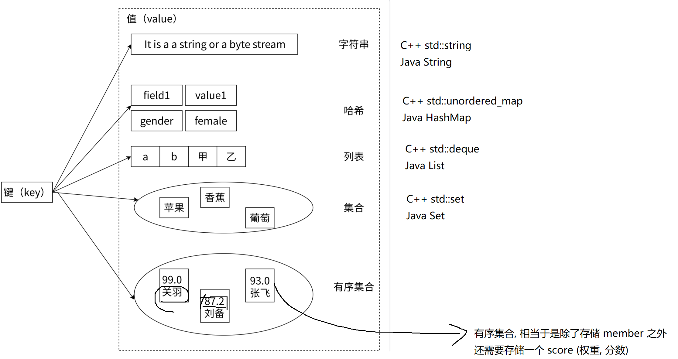 - zset: 有序集合 . zset 中存入的元素, 除元素本身外, 每个元素还关联一个 score(权重/分数)